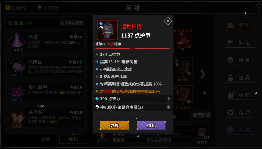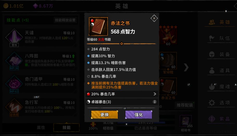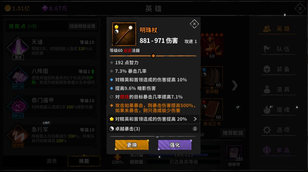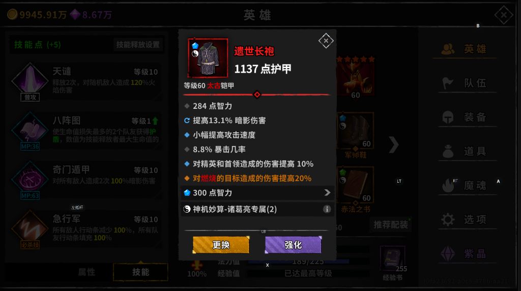 重中之重又来了,诸葛亮,诸葛亮到了这个阶段需要考虑的就很多了。首先魔魂选择,龙母+恶魔之王+梦境吞噬者+熔火魔龙,其次套装选择,2专属+3卓越暴击,次选2专属+3进阶智力,再次选2专属+3智慧传承。2专属非常重要,诸葛亮在有了成品魔魂和2专属套装之后会有质的飞跃。当我们有了专属和魔王之后,我们诸葛的装备选择就很简单,智力,暴击,爆伤,暗伤,橙装也就是军师套,军师套的词条完美契合诸葛亮,武器我们可以用秘法统御或者火龙杖,副手选择五词条的赤法或者奥法。