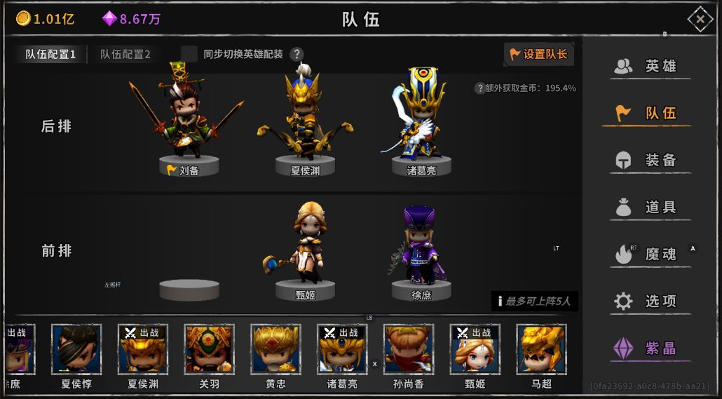 刘备,队长人选,装备选择黄金将军套(红装)洗出金币加成,武器选择地图攻击,金币加成,地图暴击词条匕首即可,副手金币加成即可,速度要求比诸葛亮快,魔魂选择纯五星角斗士