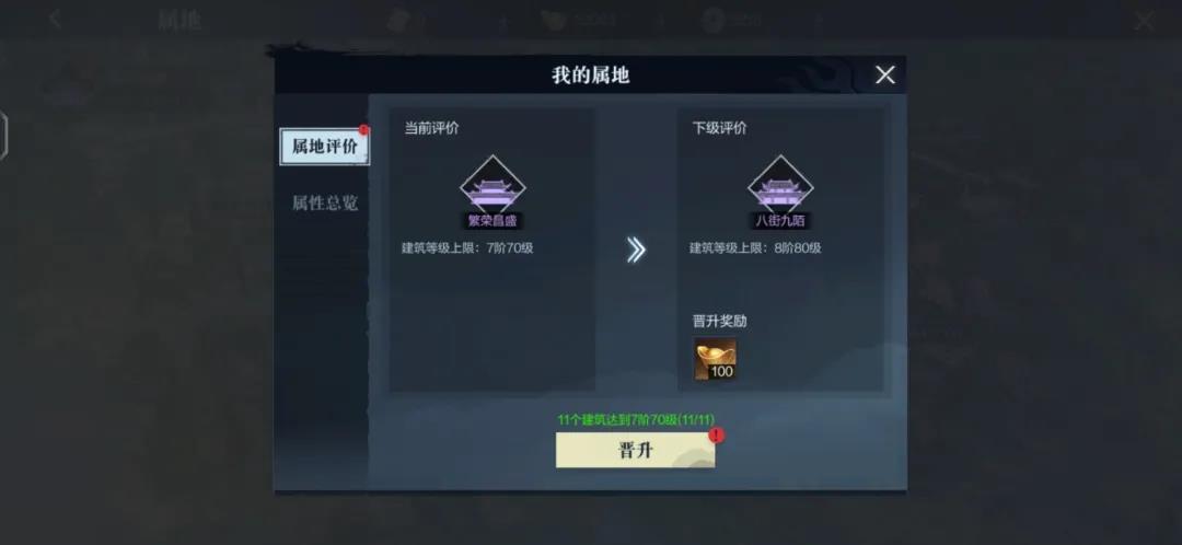 每一片属地都有铁匠铺,工坊,校场等总计十一种建筑,属地可以通过升级建筑来晋升阶级,每次晋升属地阶级就会获得新的评价,并且获得晋升奖励。