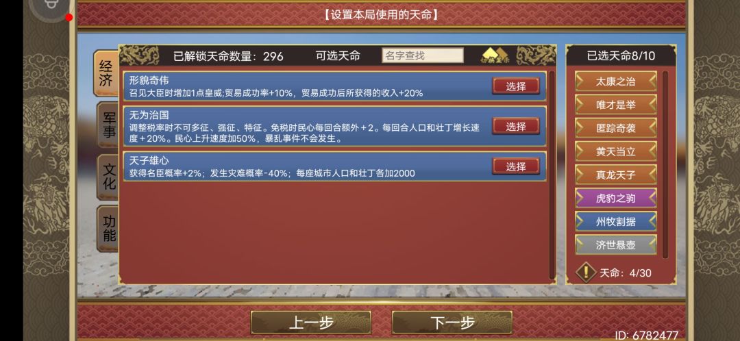 这是8个天命,加上左边无为治国,天子雄心。正好10个,且用完天命点,舒服。