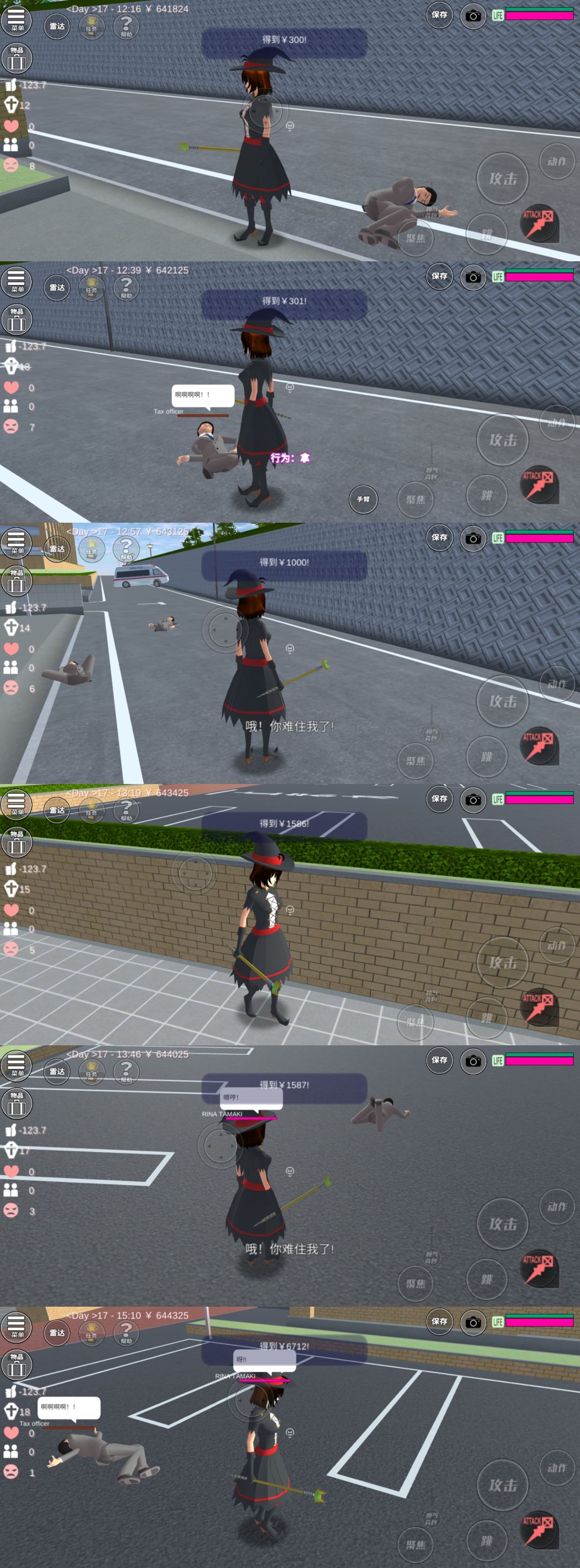 所以我想能不能借刀s人,拉仇恨,引怪让他们误伤其他的NPC,让他们打起来吸NPC的钱。于是就把警察、喷火猫、骑警、外星人、向日葵组和桃子组都试了,税务员被干掉后捡钱,能挣,但不多。有时候300涨到1000,有时候1000涨到1500多。