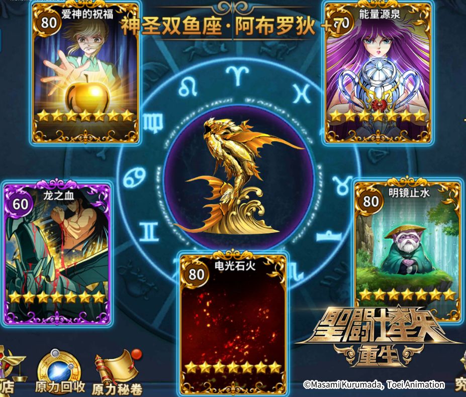 在究极之力搭配上,可选用阿赖耶识、明镜止水、能量源泉、龙之血、电光石火、爱神的祝福等究极之力,增加神圣双鱼座·阿布罗狄的生存能力,最大程度发挥他的辅助优势。