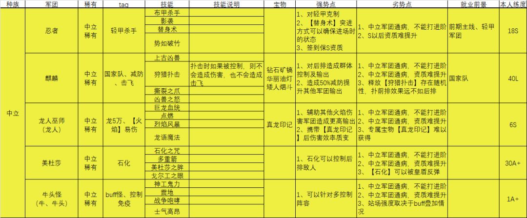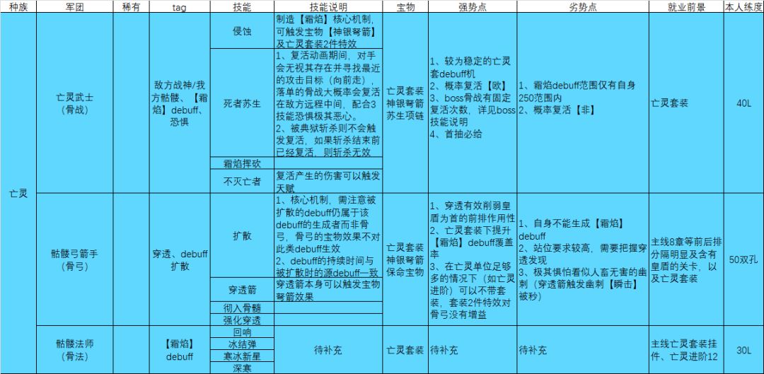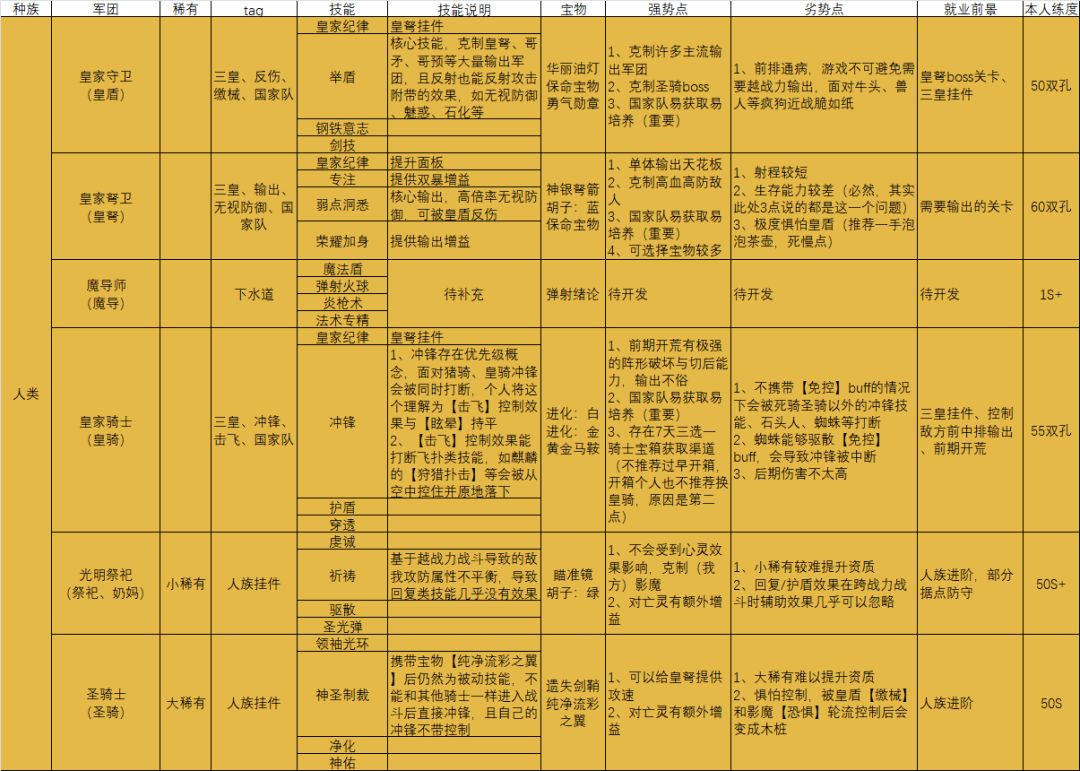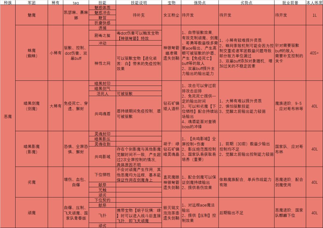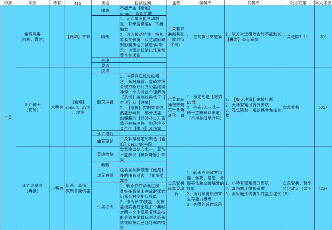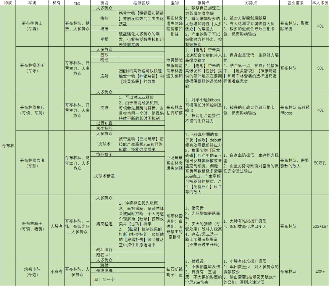 说明:1、本表适用版本1.2.8(哥布林套装版本),所有tag/技能说明/宝物/优劣分析/就业 均依赖于本人对其理解,可能有误可能遗漏,本人的练度已经跟在表格后面供参考