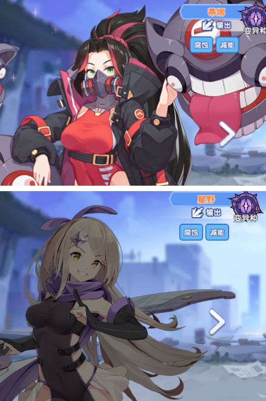 前期靠断罪,后期就要考腐蚀核心了。蒂娜必杀前排腐蚀+挨打概率腐蚀,专武提升腐蚀倍率觉醒提供回血,攻守兼备,属于腐蚀队上腐蚀的一把手。星野和蒂娜很类似,但是把其中的防守全部变为了进攻,腐蚀清除后的百分比伤害更是给星野提供了更高的上限,腐蚀叠起来之后输出简直离谱。这两位玩变异队的建议优先兑换,很难被替换。