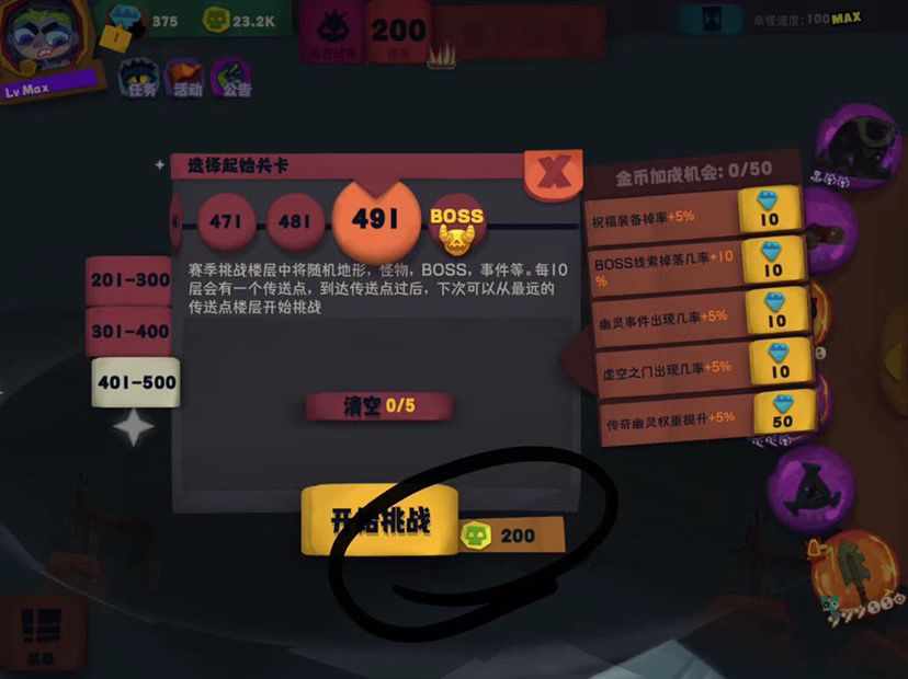 3.萌新进游戏爬层共 500层1-200是为无尽楼层,200-500是为赛季挑战楼层(更新赛季重制),其中200-500层每10层才能存档!!!