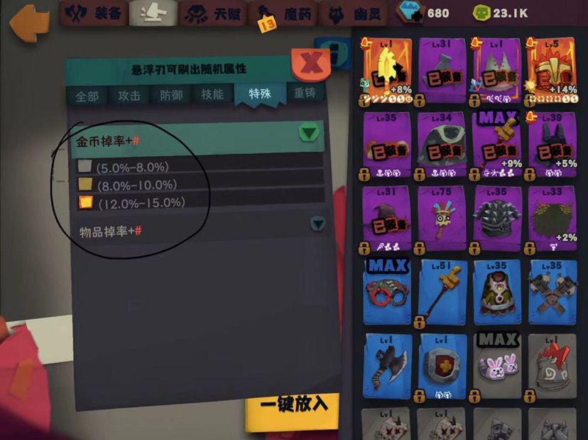 (图里两个词条在其他游戏可能很逆天,但是在这个游戏里基本无用,萌新别着急用特殊重随石给武器洗)
