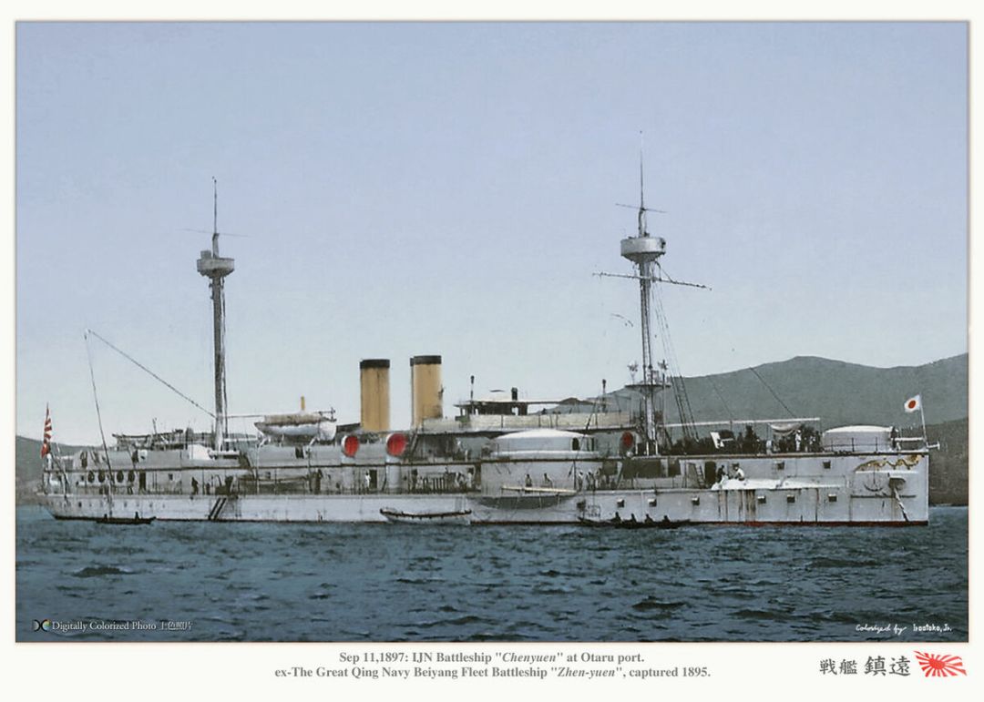 甲午战败的代价是惨痛的。日本人保留了镇远舰艏龙纹,在舰上竖起了他们的旗帜,炫耀着他们的战利品。