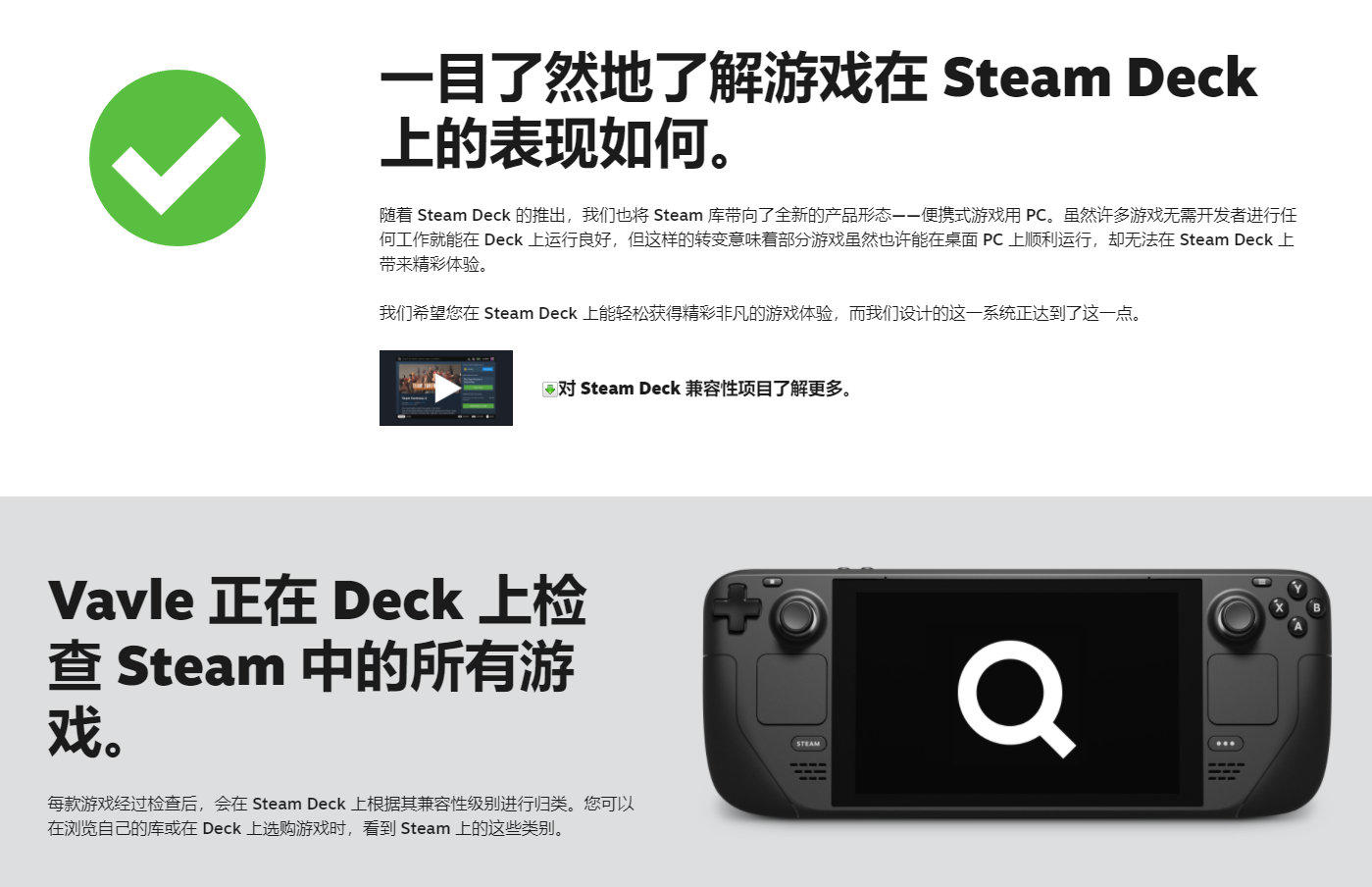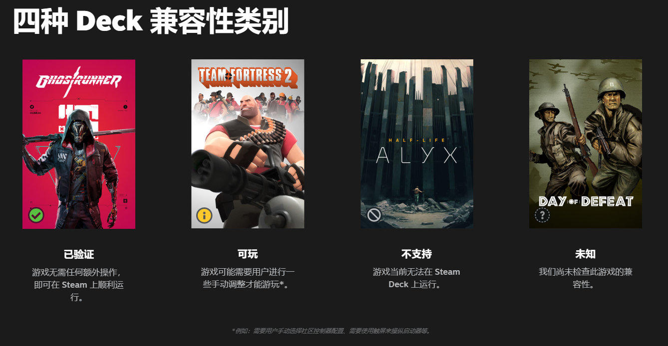 V社官网公开介绍了「Steam Deck」掌机上四种表示游戏是否可兼容掌机的图标,分别为“已验证”、“可玩”、“不支持”和“未知”。
