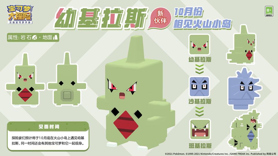 十月下旬,幼基拉斯将与此前曝光的一众小伙伴正式登陆《宝可梦大探险》,届时将有一大波新玩法来袭,全新招式学习,全新探险阵容,全新食材料理等等期待各位探险家的研究与发扬!