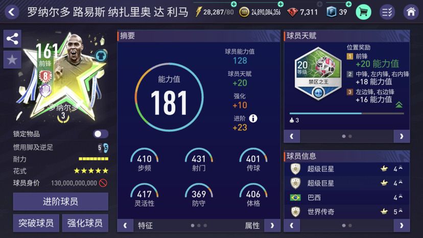 大罗一直在用游戏中处于一种不温不火的存在,很多时候靠的是信仰获取,但其实大罗在游戏中还是挺吃香的。本次荣耀系列大罗没有给到新天赋终结者,而是采用了原来的禁区之王,有点可惜,要是配上终结者的话大罗会更强。数据方面都是目前的顶级水平,无需过多纠结数据。实战中的大罗表现也非常不错。首先大罗的跑位非常优秀,在进攻路线中的前插非常多,而且几乎都能直接创造打门空间,这样的跑位表现非常有助于大罗适应中路过顶球长传打法、地面短传渗透打法等各种中路打法,他的终结能力一定会让你的锋线得分效率更高。除了跑位抢点得分能力外,大罗的盘带手感也非常流畅,他的花式衔接非常快,而他的对抗能力,保护能力也都很出色,内切后搓射,更是兼备弧度与球速,且起脚很快,打门的抗干扰能力突出。这对于喜欢内切得分打法的玩家非常合适,他的加入一定会让你的内切得分率更高。总体来看大罗的进攻能力非常全面,无论是下底传中、内切搓射、中路渗透等等这些打法大罗都能很好地适应。