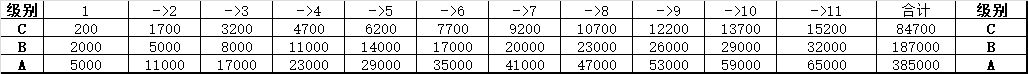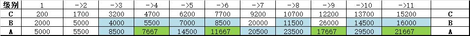 结合商品售价提升幅度,核算出商品级别提升1售价升级所需资源,如下表所示(其中绿色最合适,蓝色比较合适):