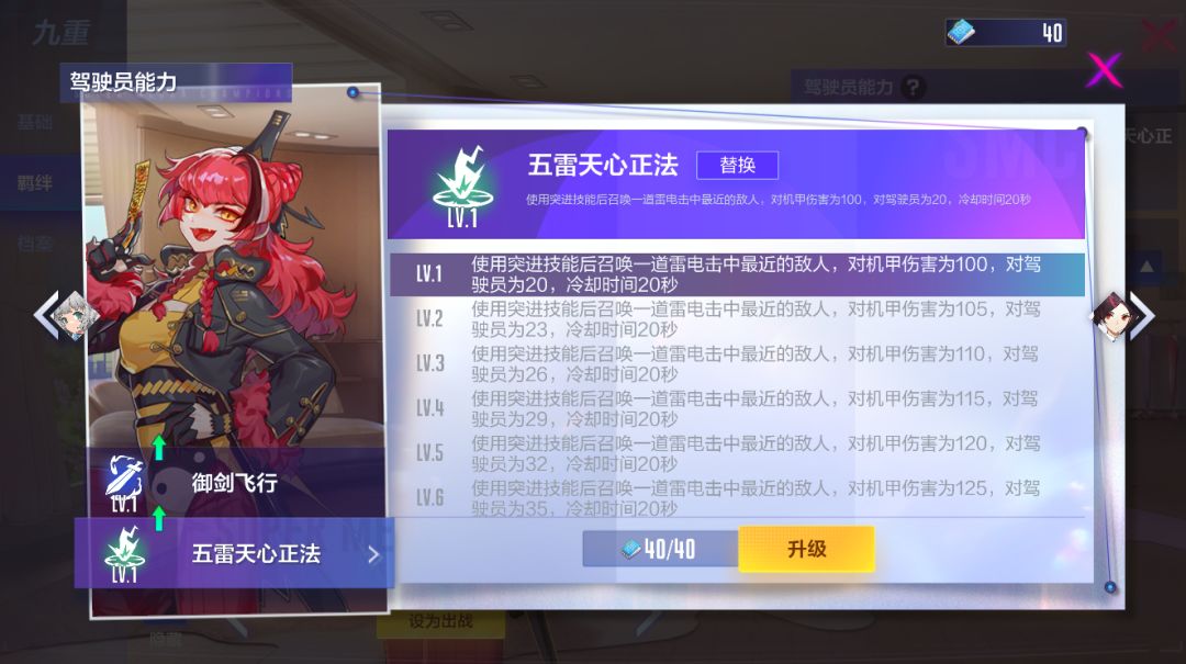 五雷天心正法:使用突进技能后召唤一道雷电击中最近的敌人,对机甲伤害为100-125,对驾驶员为20-35,冷却时间20秒