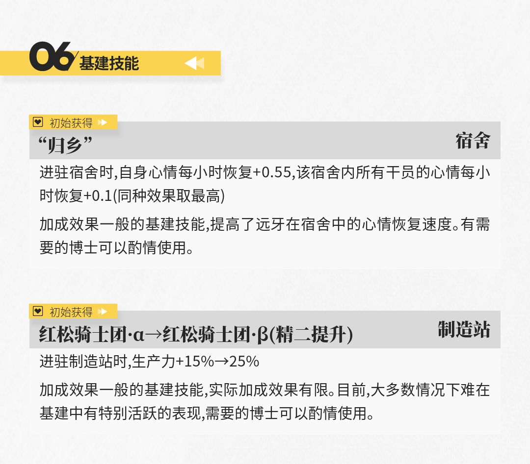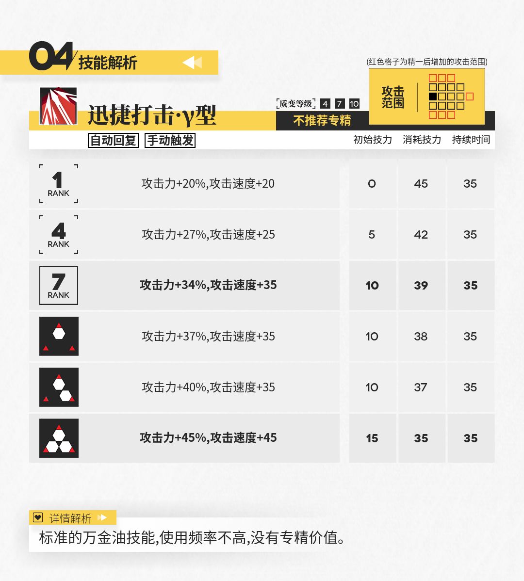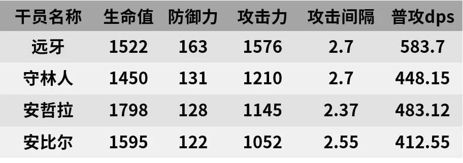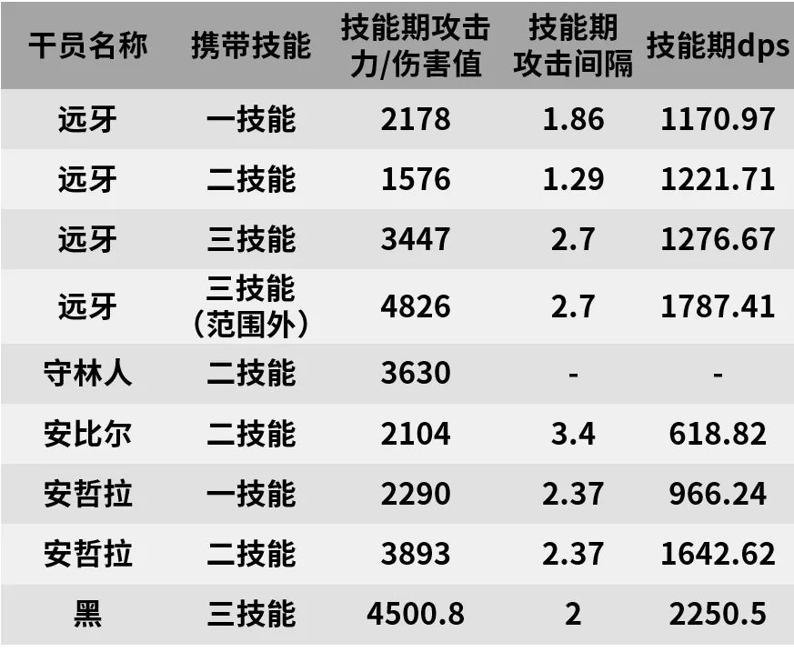 注:该模块的所有数值均为在干员精二满潜满级满专精的情况下计算。表格中所有数据所呈现的情况均为该干员的满配峰值情况,即满级、满潜、满信赖、满技能等级、满天赋加成。所有非100%概率触发的天赋不参与数值计算。所有光环类天赋仅对拥有该天赋的干员自身生效。