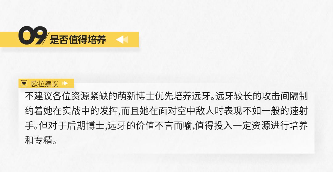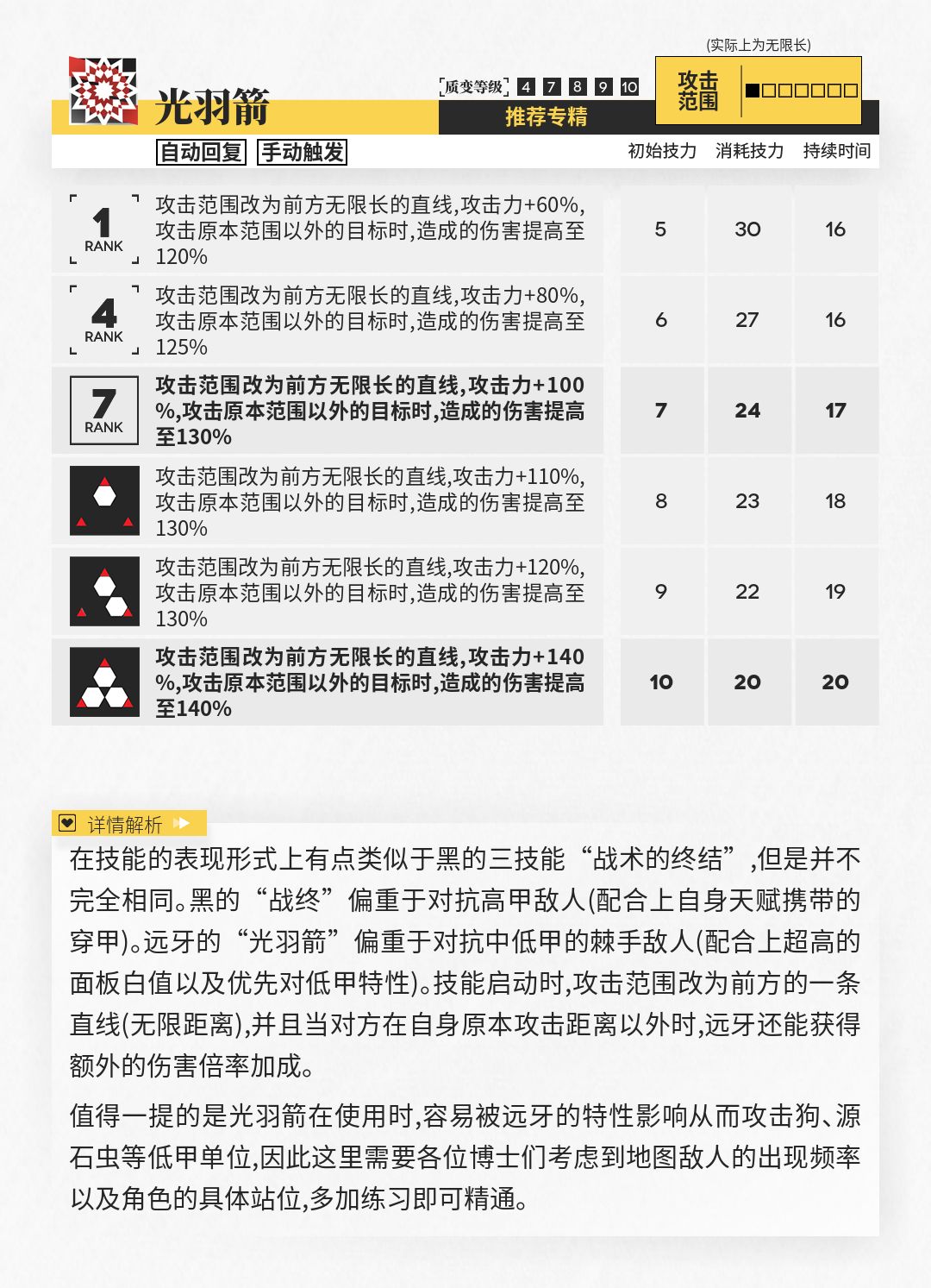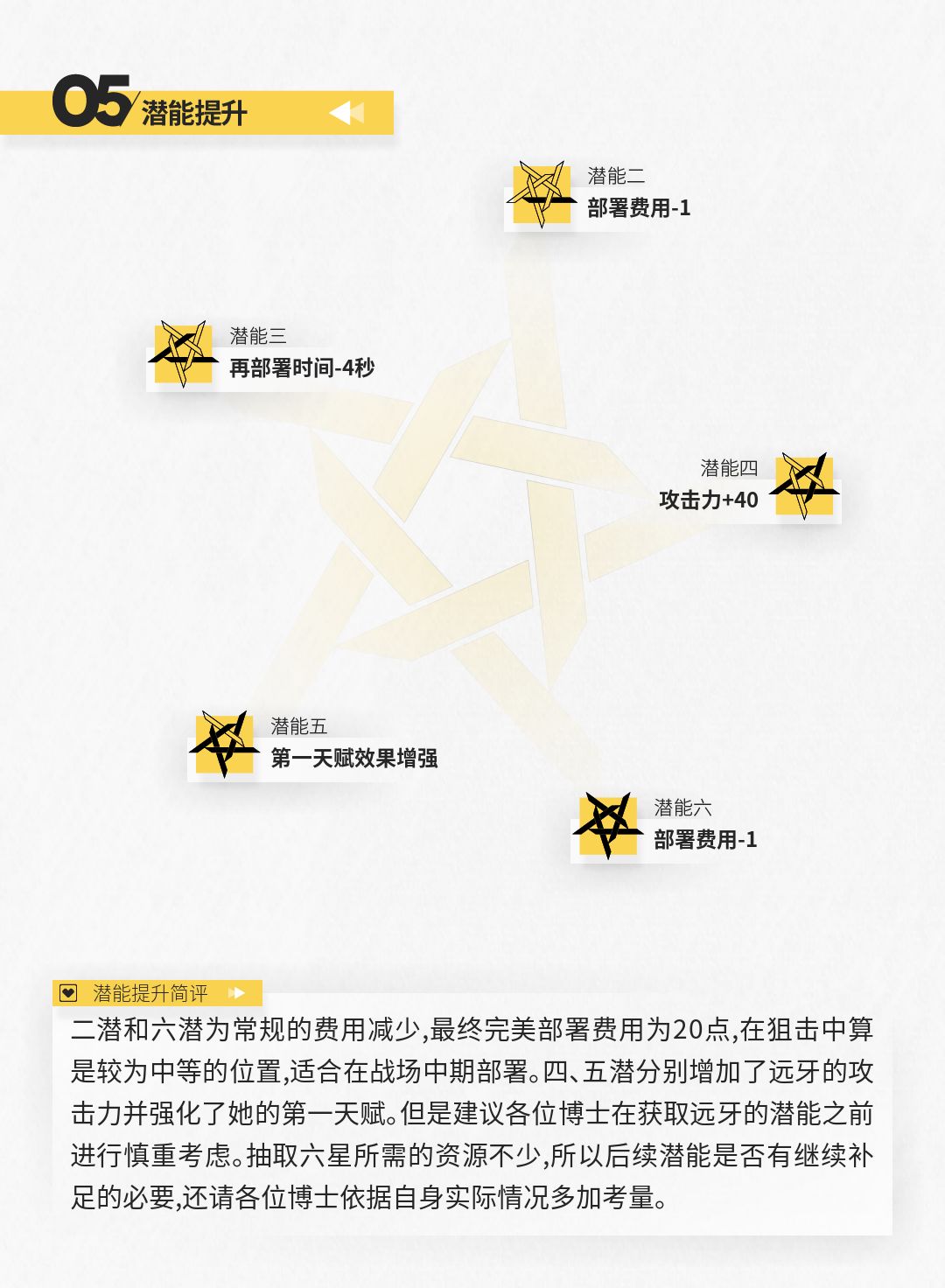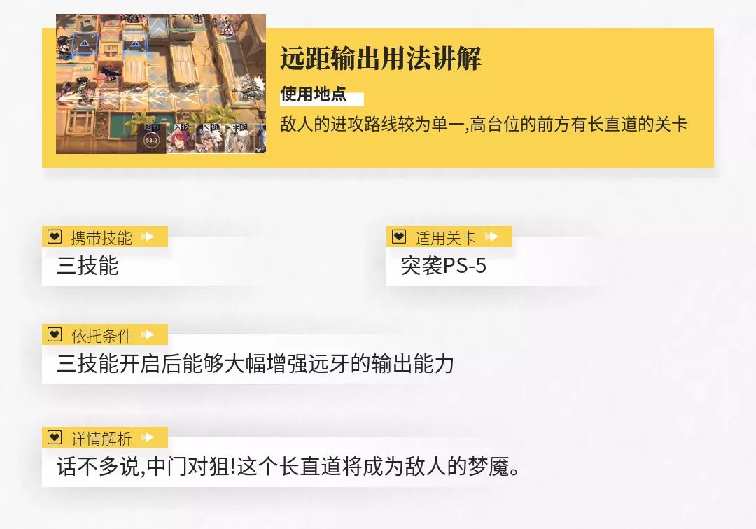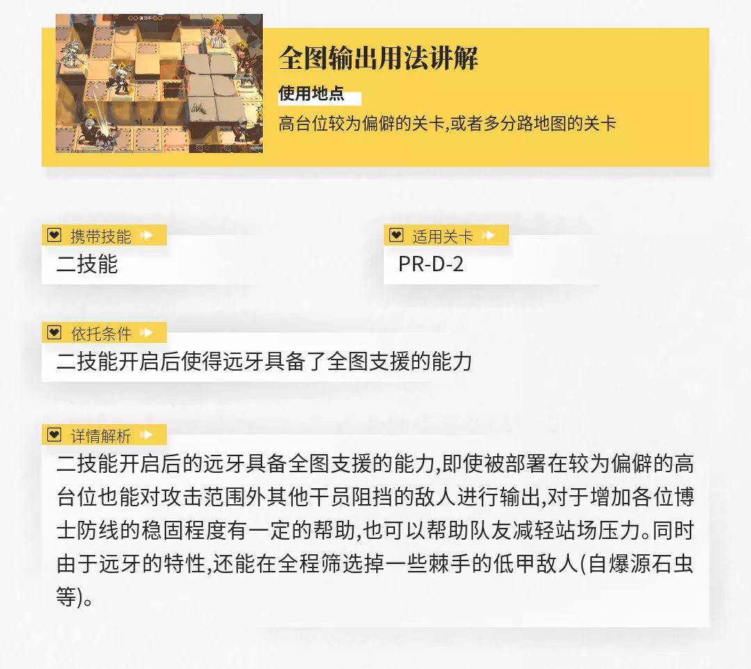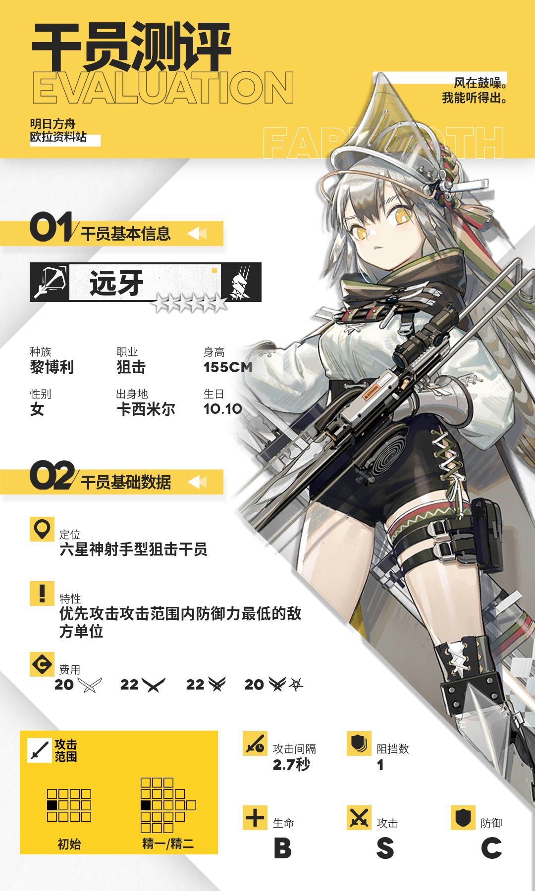 宽广的攻击范围,较高的攻击力,较长的攻击间隔,这都是各位博士对于神射手的印象,而如今作为神射手顶点的远牙终于实装了。她会改变刀客塔们的刻板印象吗?让我们从这个部分走进远牙,更好的了解这个攻击力超高的狙击干员,为她在实战中的表现做好准备。