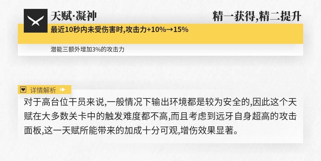 作为六星干员,远牙的输出能力自然是同分支中最高的。而且虽然较长的攻击间隔在一定程度上限制了远牙的实战发挥,但她开启三技能期间的DPS还是相当不错的,是各位博士进行攻坚时的好选择。