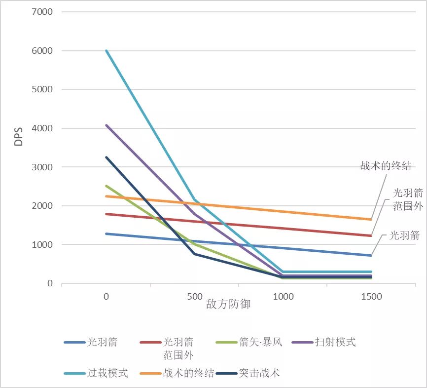 也许上表中的数据仍然不够直观,那就来看下面图中这些狙击干员们的技能期DPS对比吧。从图中可以看出,超高的攻击力使得远牙几乎不可能抛光,因此三技能光羽箭的DPS曲线走向(无论是否在远牙原本的攻击范围内)与黑的战术的终结有着非常一致的趋势。这也意味着这个技能所受敌人护甲上升的影响要比图中其他狙击干员的技能小。并且如果在远牙自身攻击范围外打击敌人,即使面对1500护甲的高防敌人她也能保证稳定的破千输出。