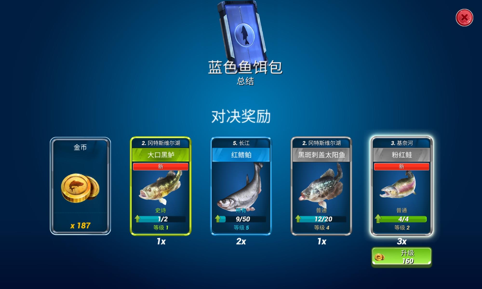 终于出了第2个地图就差这一个,没想到是在蓝色的对决奖励肝开出来的。这波运气真的是好,虽然不多,但是前两个地图所有的鱼儿已经都收集齐了。后续就不用再升级了,基本上都7级左右了,感觉对决的时候已经够用了。