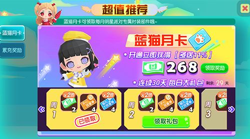 蓝猫月卡在一周内可以补领之前的奖励礼包