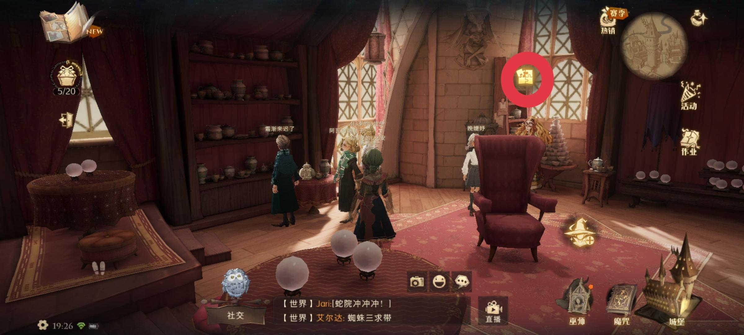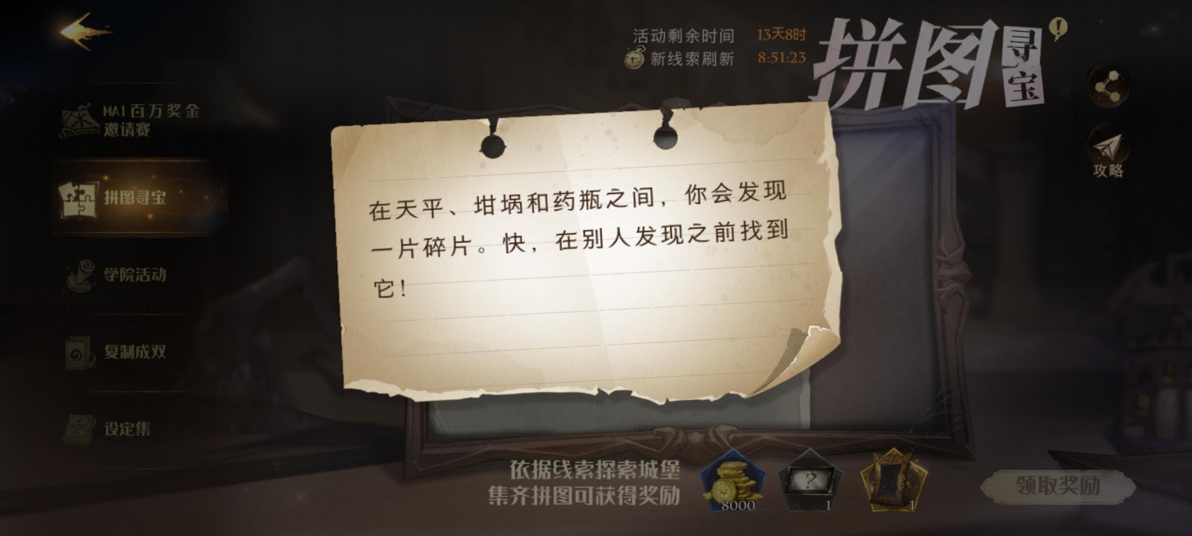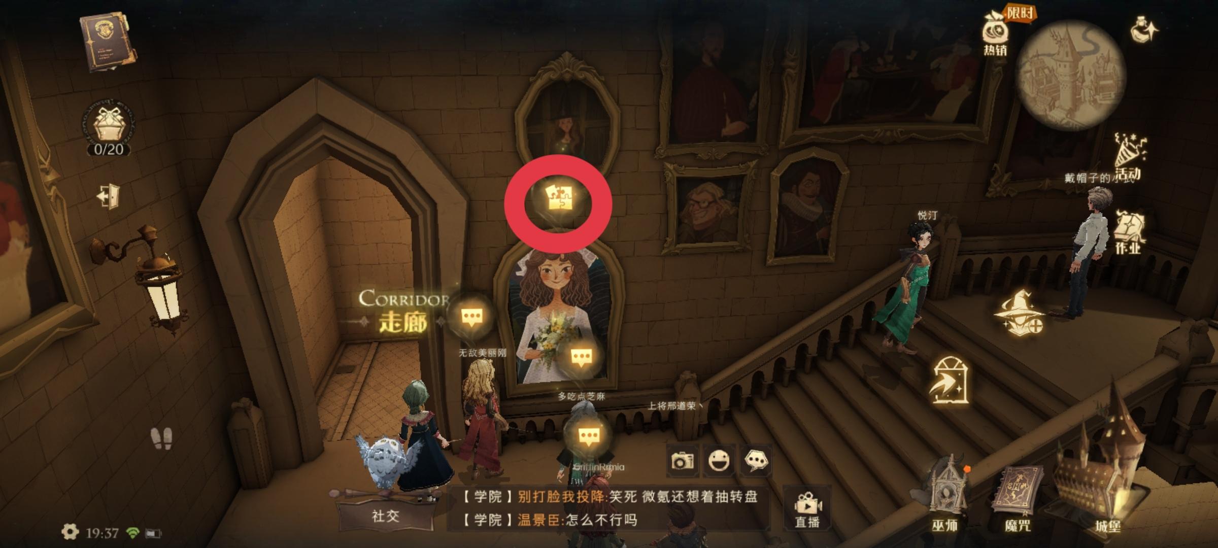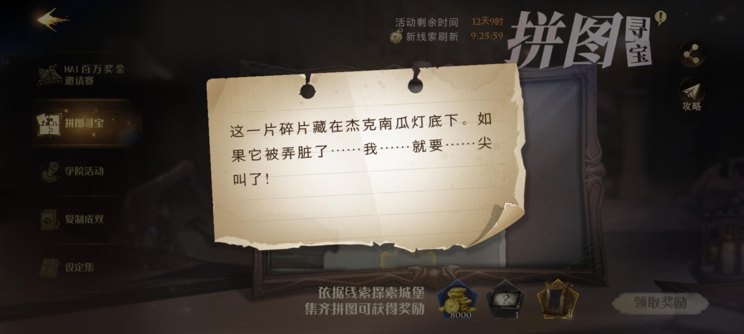 进入霍格沃茨礼堂,直走到头,会出现拼图标志,点击进行对话,然后点击图三圈出的金色小球即可