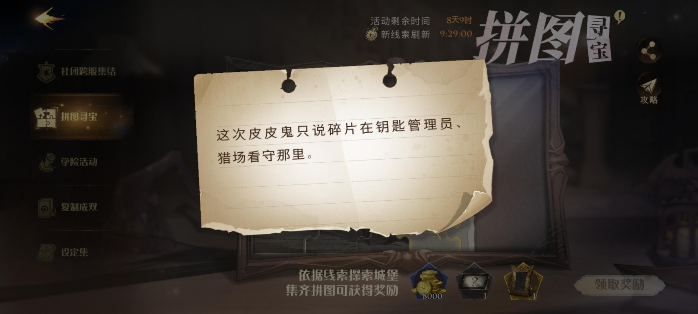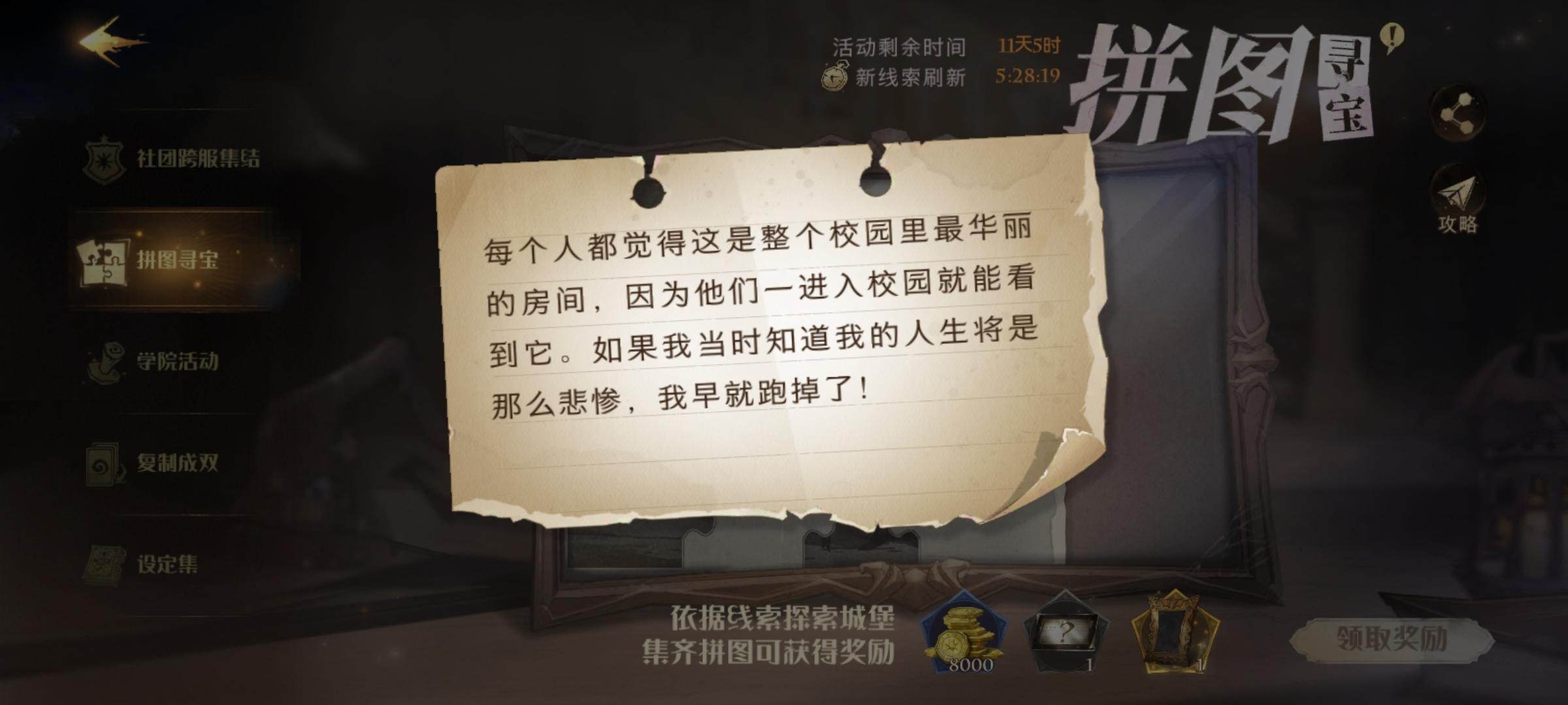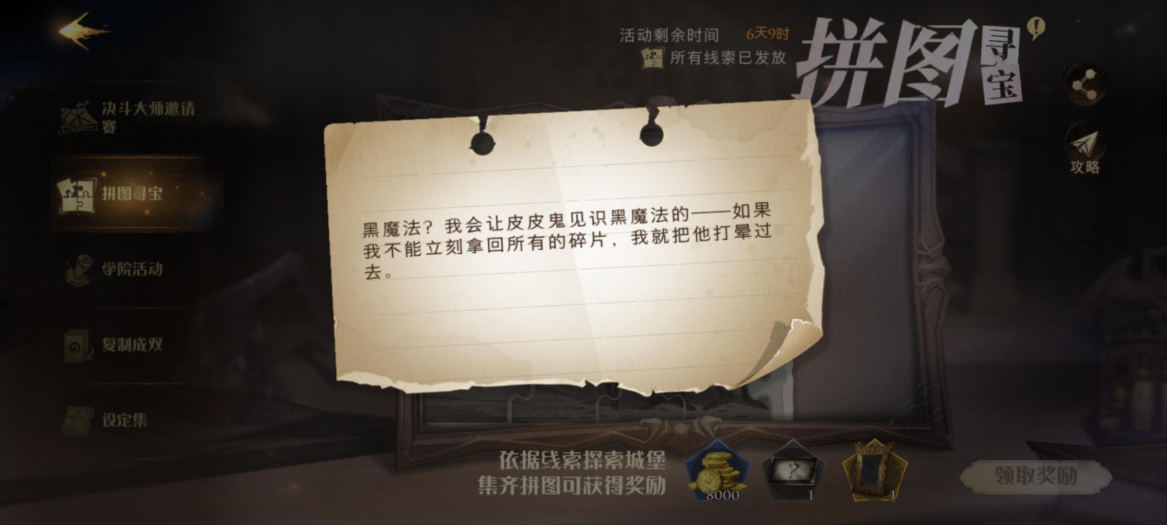 从图书馆的门口出来,向黑魔法防御术课教室方向的墙上,有一幅画上有拼图标志,对话即可