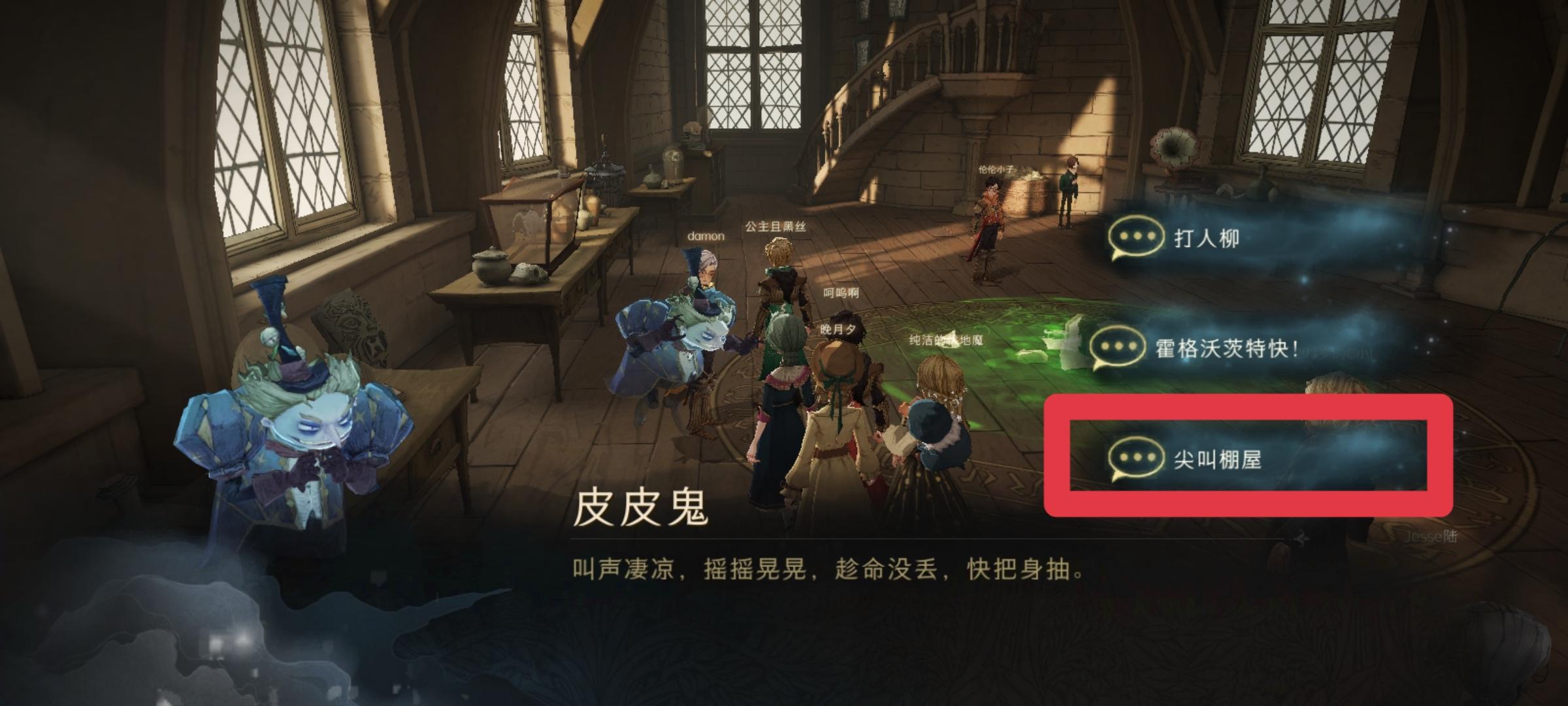 前往黑魔法防御课教室,向左前方走一点即可看到拼图标志(图二),点击进行对话,选择''尖叫棚屋''(图三),后选择开始战斗(自己配牌),战斗胜利即可