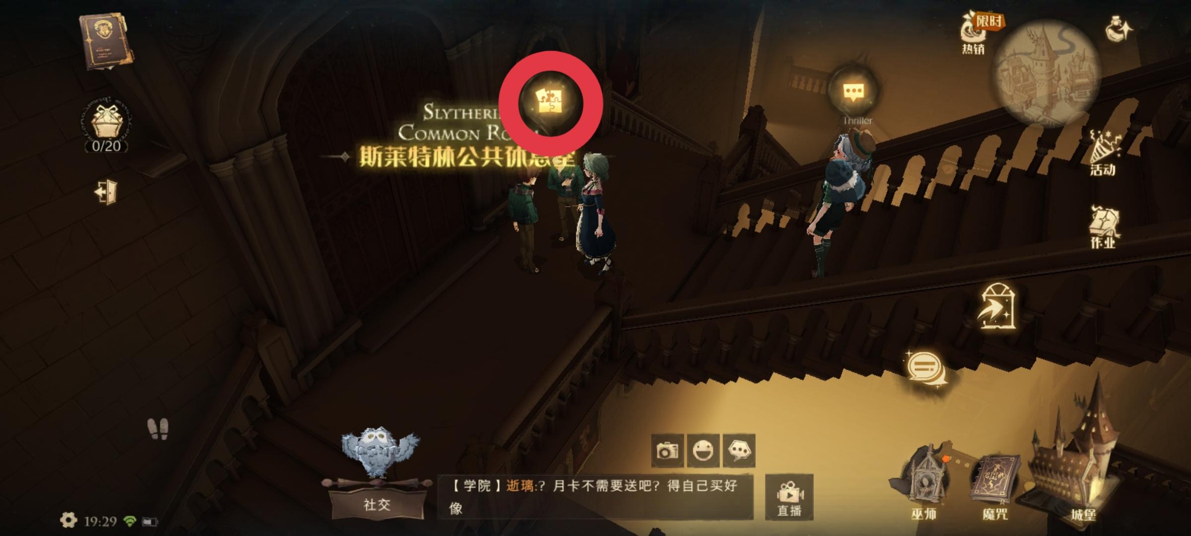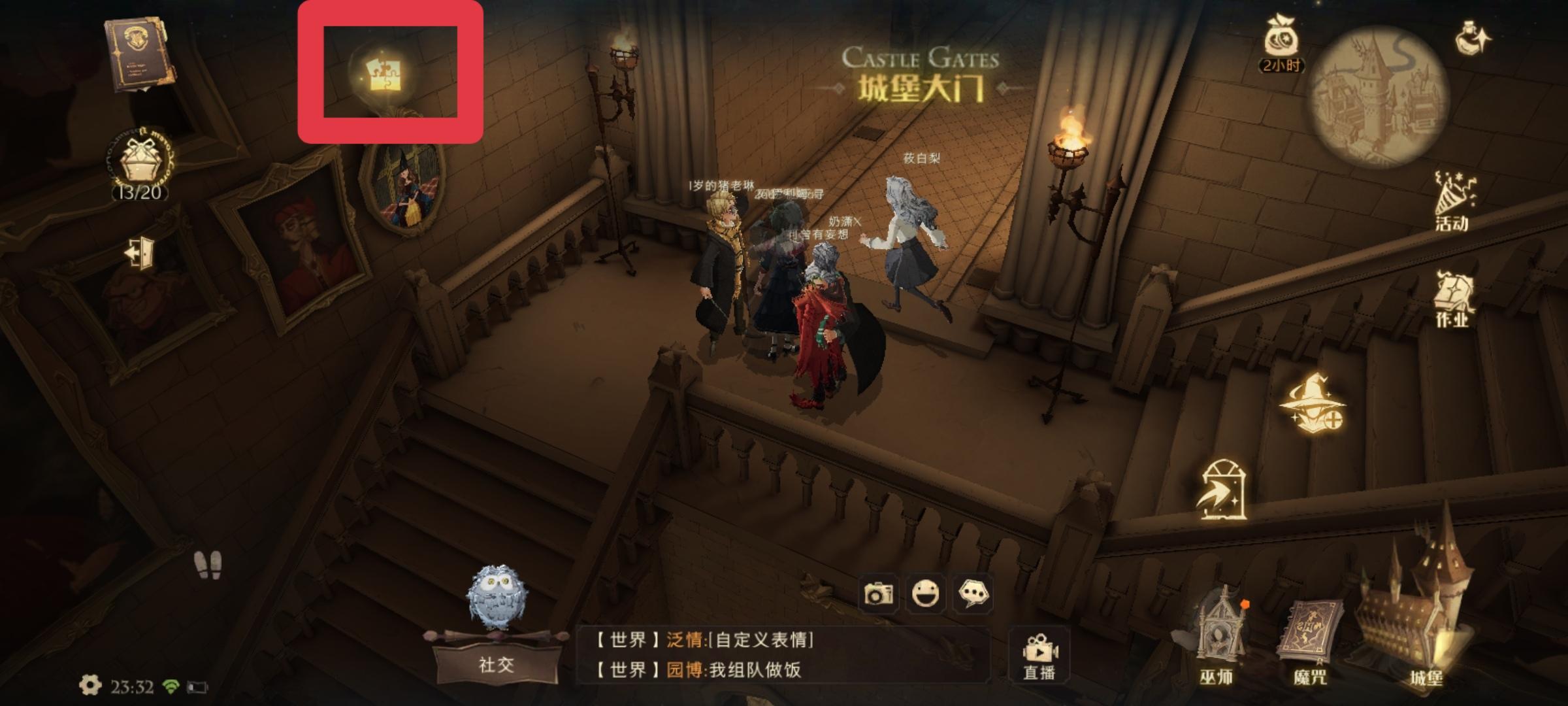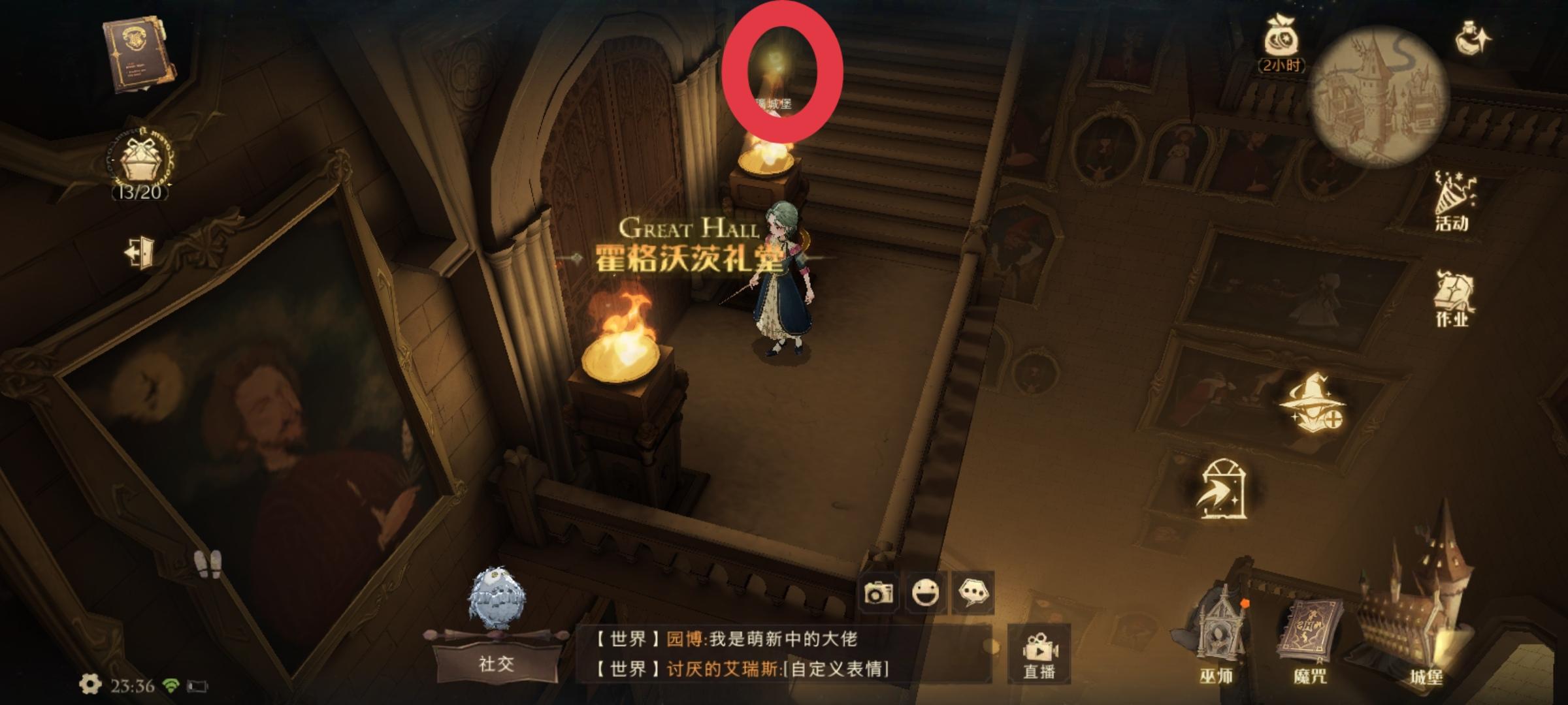 点击地图中城堡主楼,进入后就可以看到拼图标志,点击进行对话,然后快速到达霍格沃茨礼堂门外,点击图三圈出的金色小球即可