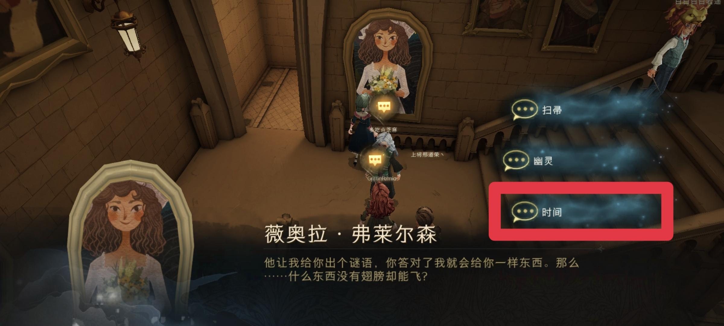 前往城堡主楼的走廊(图二方向),将视角稍向上拉即可看到拼图标志(图三),点击进行对话,选择''时间''(图四)即可