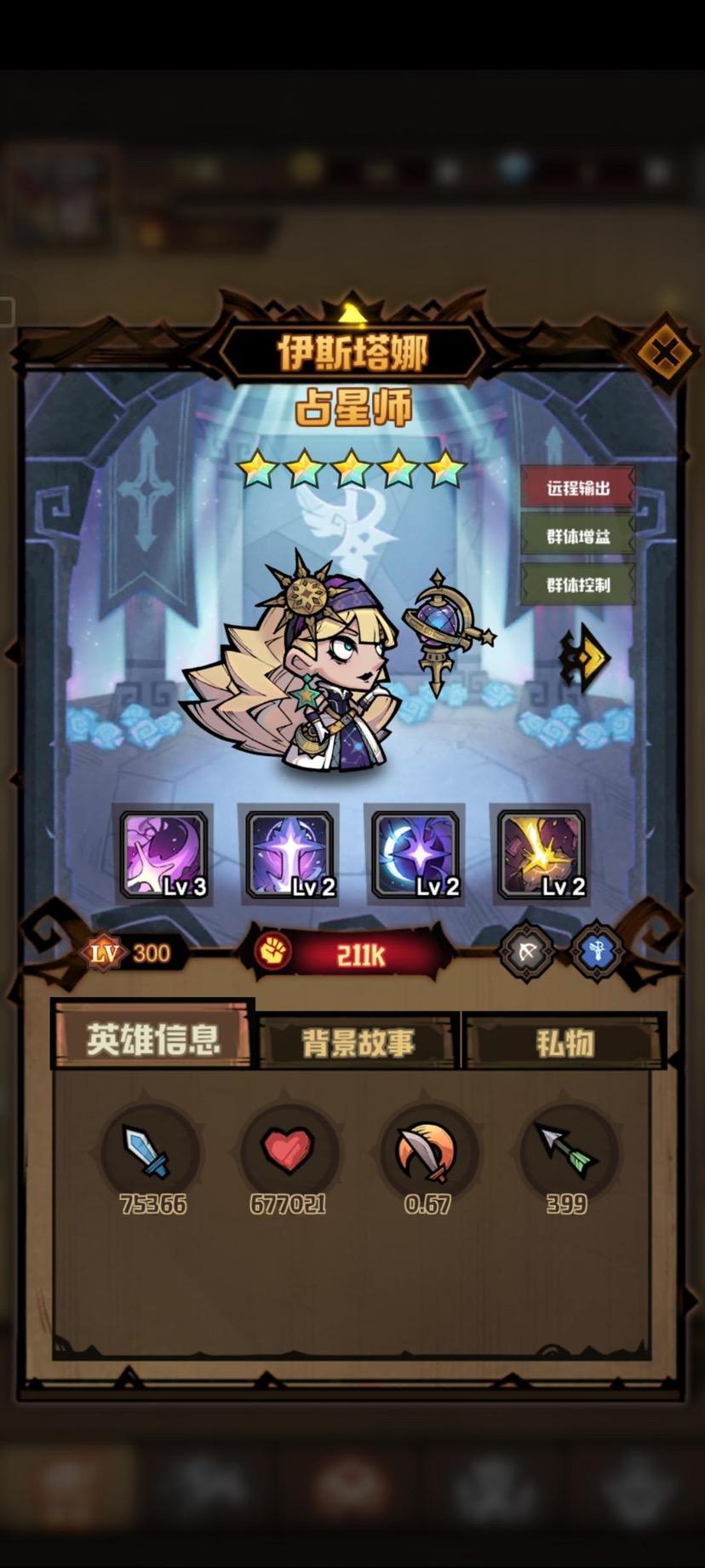 占星作为阵容的副输出,辅助意义更大一些,大招连续命中提供眩晕,被动攻击敌方有概率为友方全体提供能量,能够很好的增加阵容的技能释放频率与控制效果。星级至少6星,在6星(大招增加连续命中时眩晕敌方),7星(增加攻击时提供全队能量概率与数值),10星(大招增加连续命中时眩晕敌方的时间)时产生质变