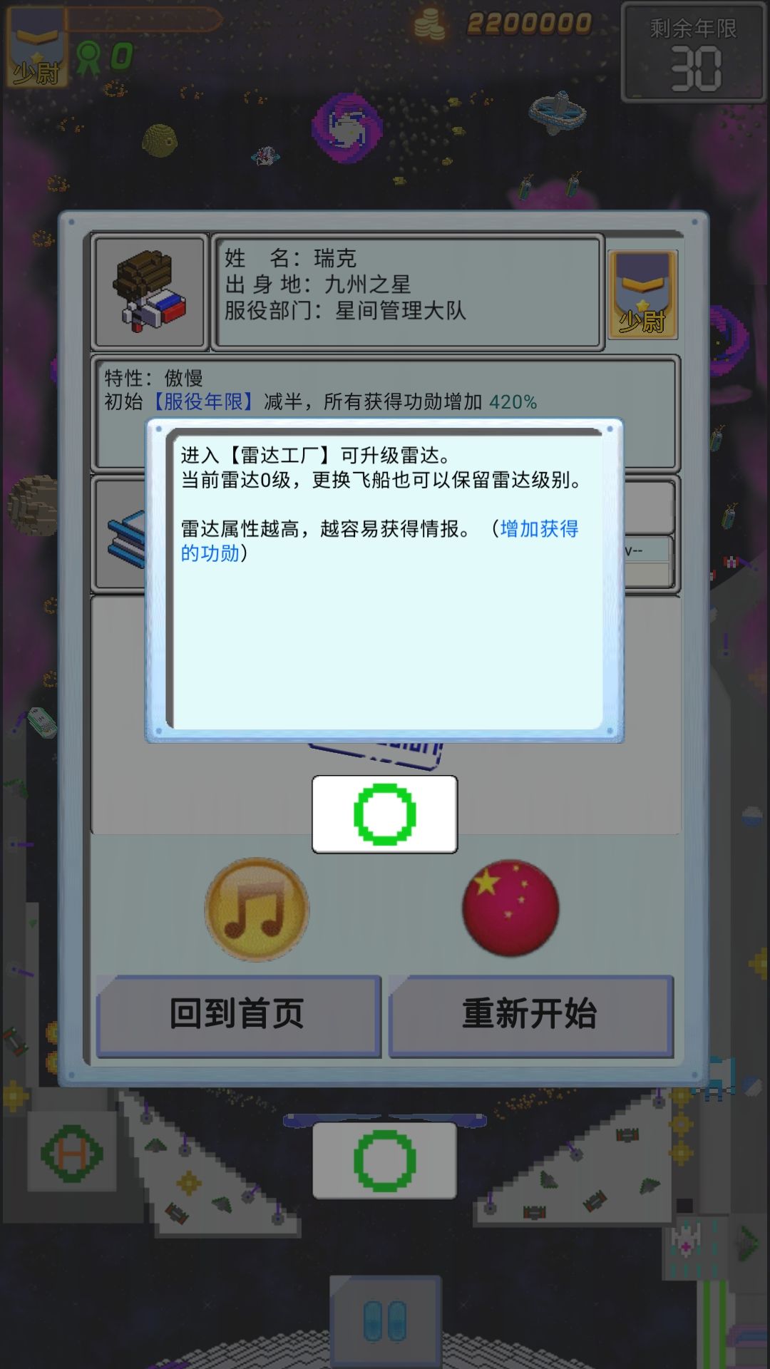雷达:增加每次得分(功勋)的数值,接任务时的任务奖励也受到雷达值影响。每2点雷达值大约增加1%的得分(但不是累乘,例如特性增加救援救生舱25倍得分、委员会效果增加10倍得分、200点雷达值增加1倍得分,实际上救援救生舱得分是最初始得分的1+25+10+1=37倍)