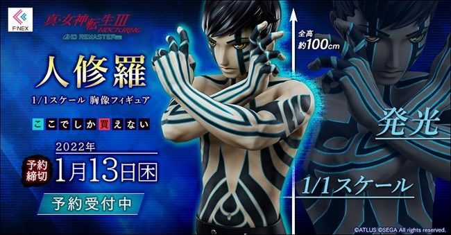 近日,ATLUS将于F:NEX联合推出《真女神转生3》主人公“人修罗”1:1等身胸像,整体高约1m,已于今日(10月21日)开启预订,持续到明年1月13日,商品将于明年10月正式发货,其价格为495000日元(含税),折合人民币约为27680元。