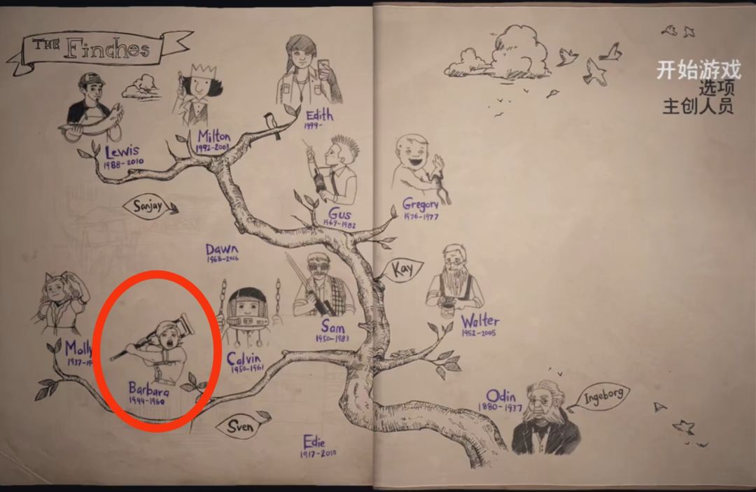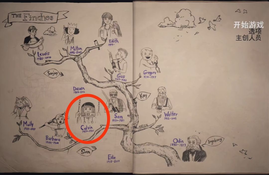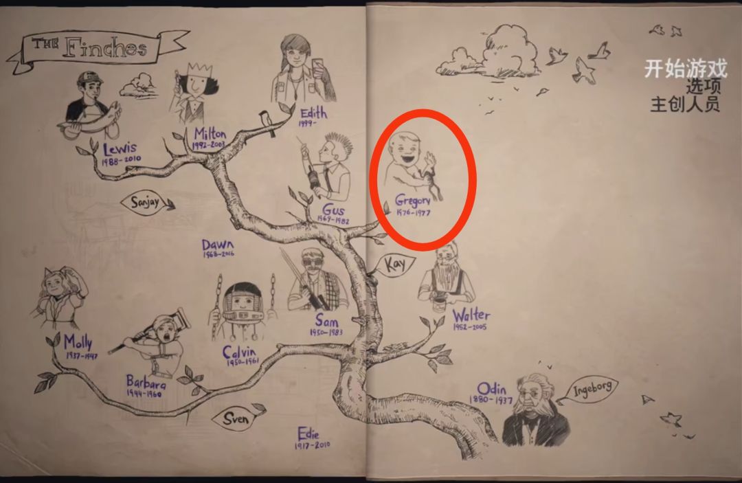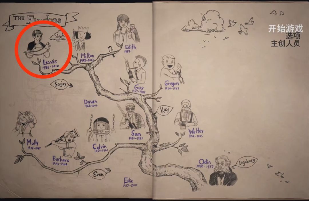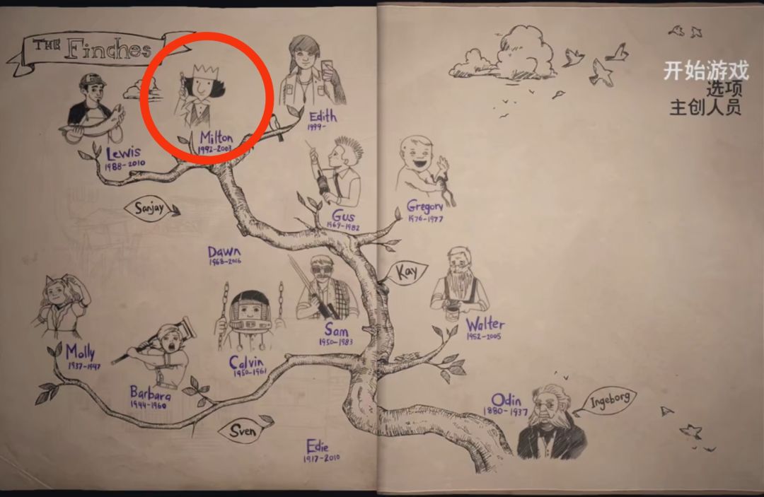 9.第九位长辈是Milton Finch(1992-2003),主人公的哥哥,热爱画画,游戏中并未提及他怎么死去,而是画了一扇门,自己走进去然后失踪了。