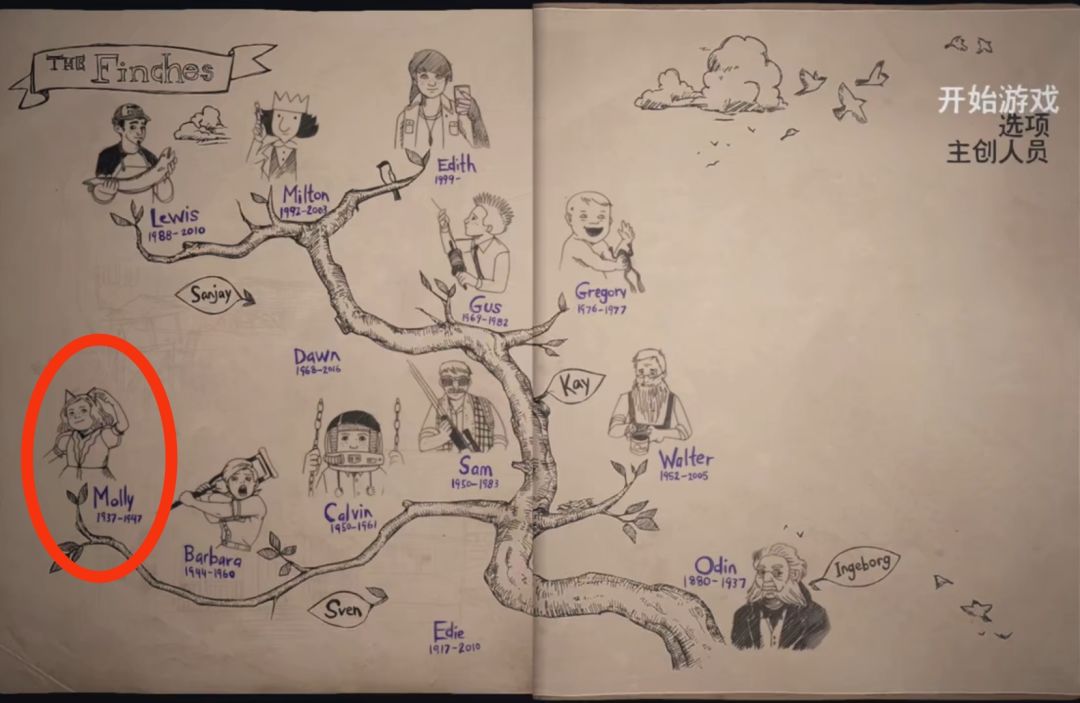 1.主人公了解到的第一位长辈是Molly Finch(1937-1947),Molly是主人公爷爷(Sam)的姐姐,通过Molly的笔记可以了解到在1947.12.13晚上,Molly的母亲(Edie)没有让她吃晚饭,让她很早就上床睡觉了,在饥饿的情况下,她吃下了沙鼠的食物和牙膏,以及不知名的红色果子(推测可能有毒),而后中毒死去。