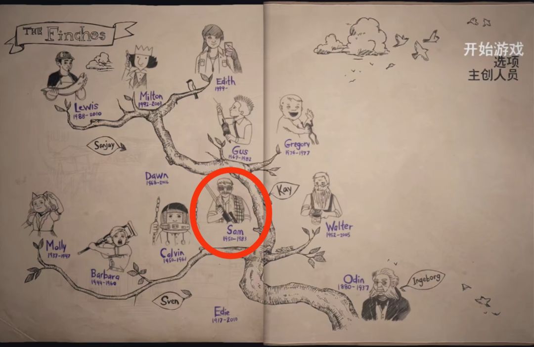 6.第六位长辈是主人公的爷爷Sam Finch(1950-1983),在1983年教授自己的女儿Dawn Finch (同时也是主人公的妈妈)打猎时,因为被击中的鹿未补刀,在Sam与Dawn合影时不幸被鹿踢下悬崖。