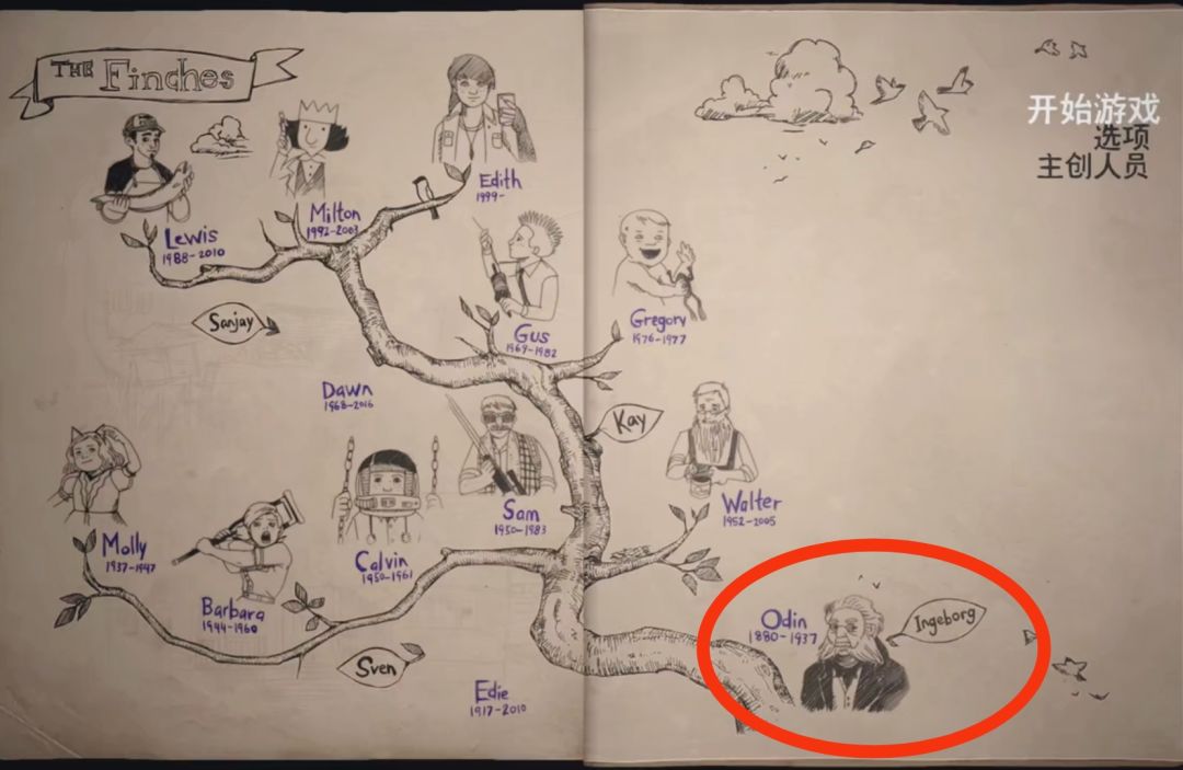 2.主人公了解到的第二位长辈是家族的创始人Odin Finch(1880-1937),他在妻子Ingeborh和儿子Johann去世后,想逃离家族的诅咒,在1937.1.7带着家人和房子出海,在海上Odin与老房子不幸被卷入海底,只剩下其女儿Edie与女婿Sven还有他们的女儿Molly幸存,到达了新岛上建立了新房子。