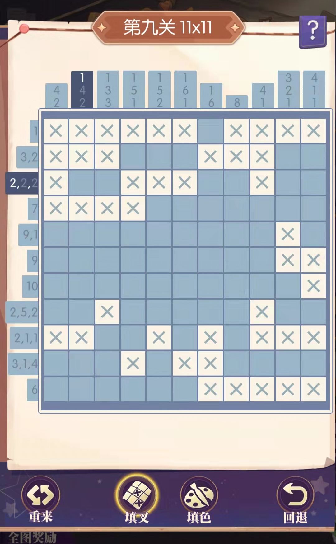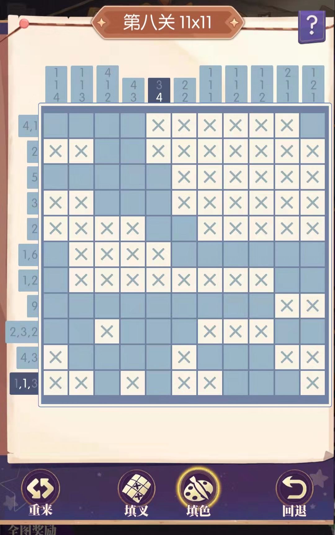 2,最终完成所有“填色”(填色后格子变成浅蓝色)即可,“填叉”(填叉后格子出现浅蓝色×)仅为辅助手段