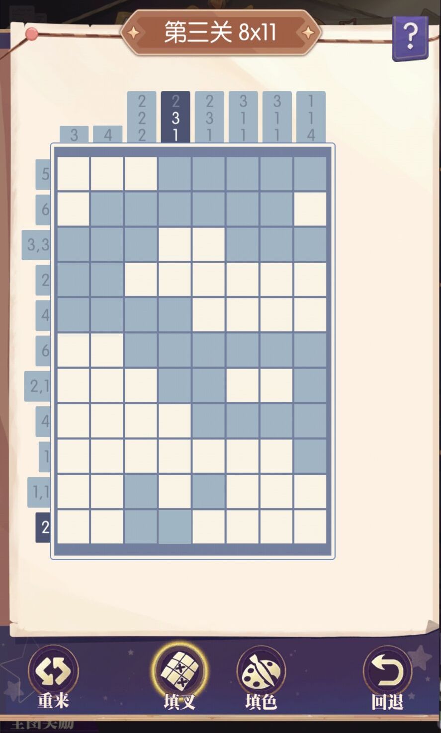 举例:第一关第二行1,3,表明第一行从左到右先有一个1个格子的填色格,然后在N个空白格后,有一个连续3个格子的填色格