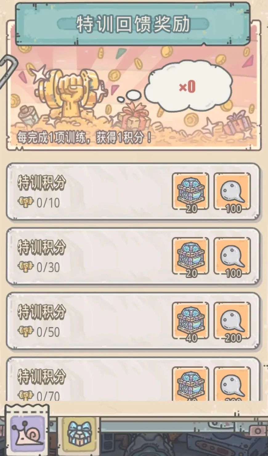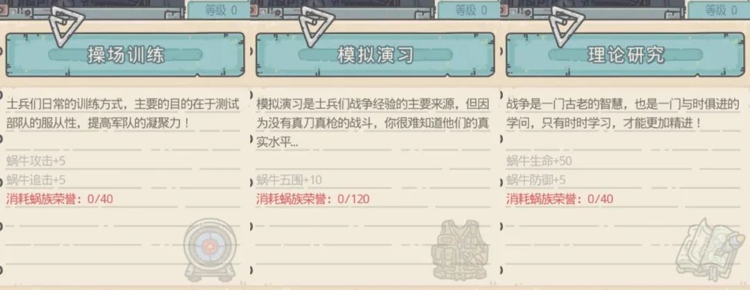 进入【蜗族老兵特训】后,我们可以看到几个要素: