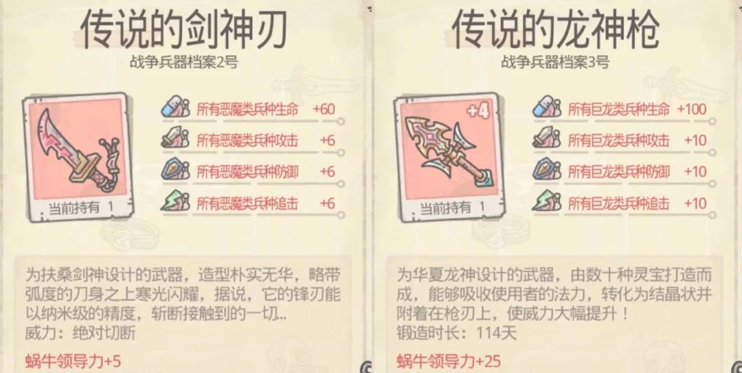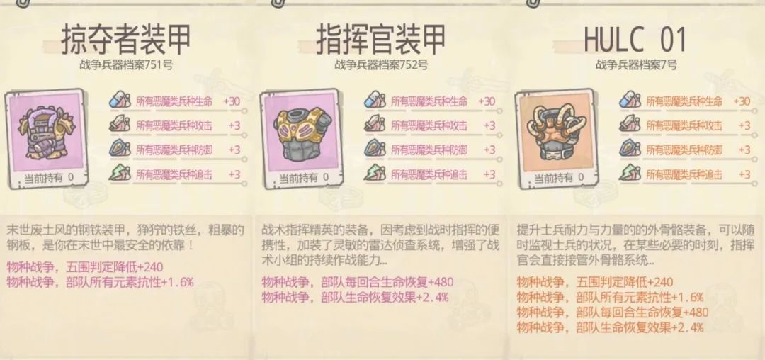 而且都是恶魔兵种,说明蜗牛官方在引导中低氪玩家、萌新玩家,一开始要朝恶魔兵种去发展,这三件装备最终是可以合成一件装备的,听说变成红色装备之后,还能增加领导力,设计的模式与其他物种装备模式相近,如图所示: