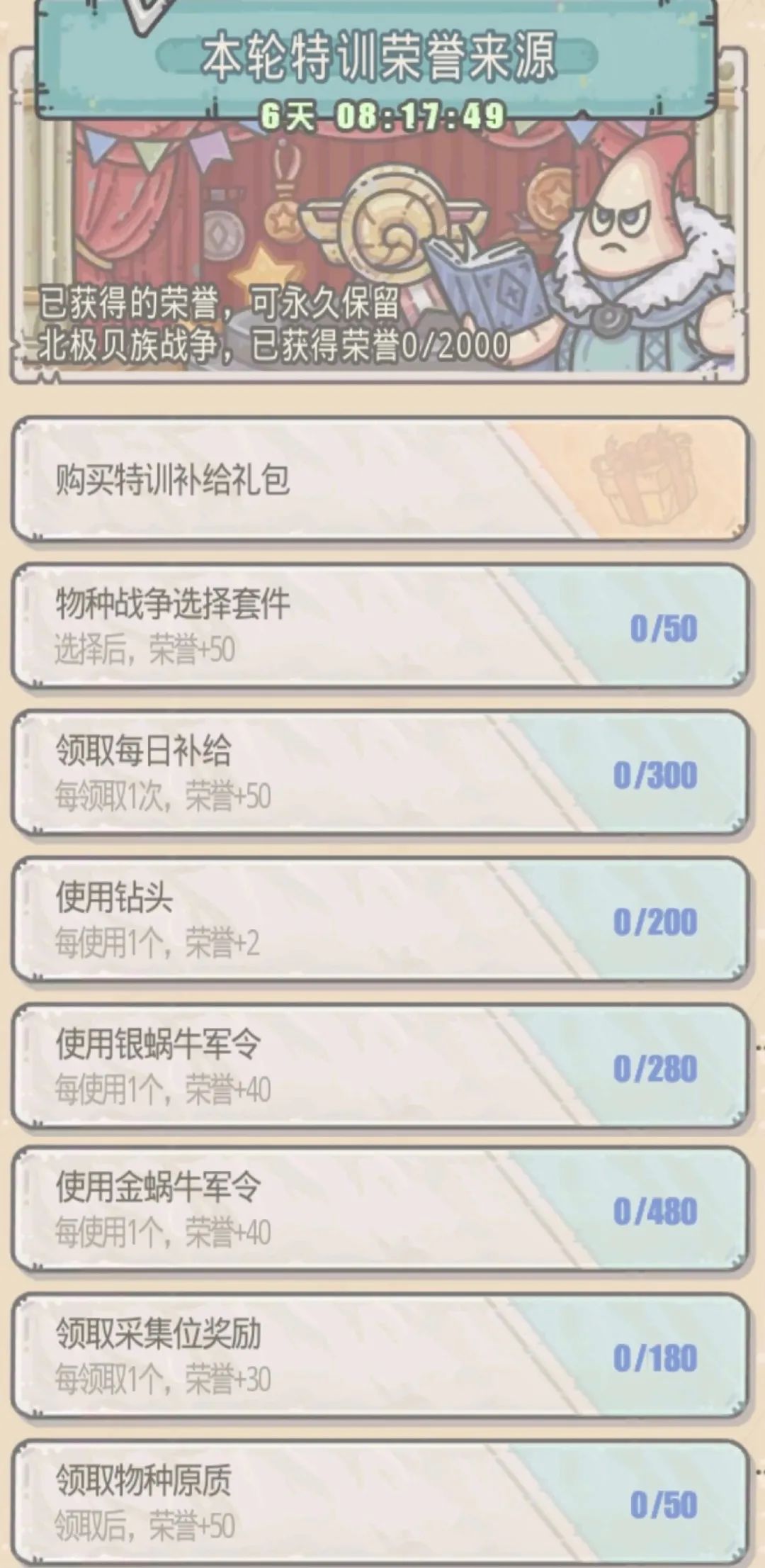 2、“已获得荣誉0/2000”,说明在本周的物种战争中,荣誉的获取上限为2000