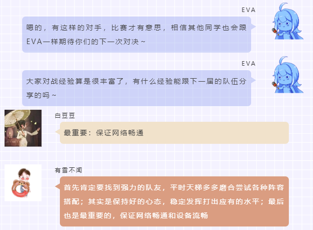 虽然第四届巅峰之路结束了,但随即便迎来EVA最喜欢的赛后采访环节!隆重为大家介绍微信区冠军战队【没啥技术随便打打】,亚军战队【快乐一家人】!