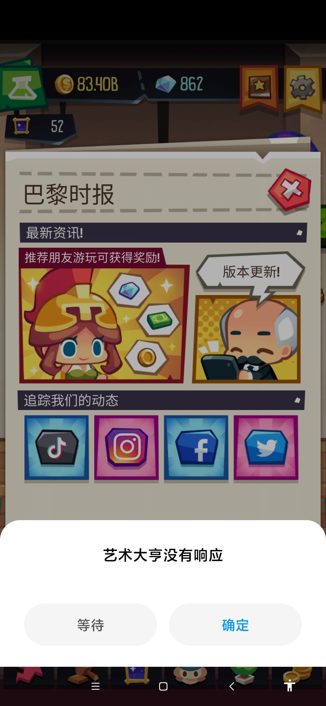 自己的博物馆展品和收银台什么的都已经满级了。结果下线在上线就玩不了了。进去无反应。卡在页面上划都划不动我以为手机坏了。换了个手机玩,玩到这个等级又是这样。艹,浪费老子时间。