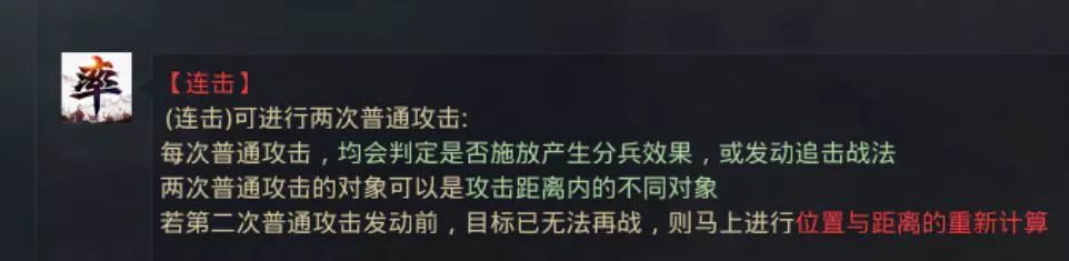 “连击”是一个状态,具有该状态的武将,可进行两次普通攻击。