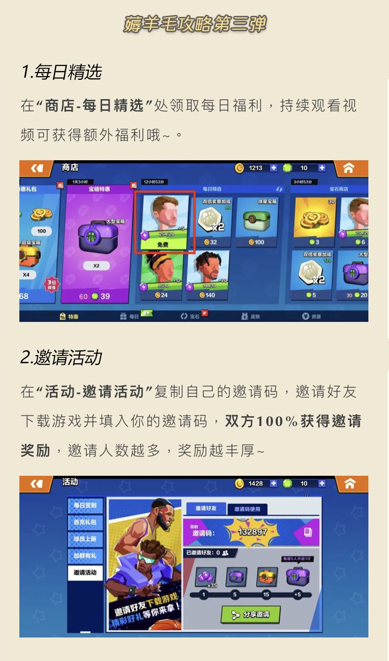千万不要错过【商店-每日精选】与【活动-邀请活动】。福利多多,“躺平”领取,各位篮球er们赶紧冲起来~