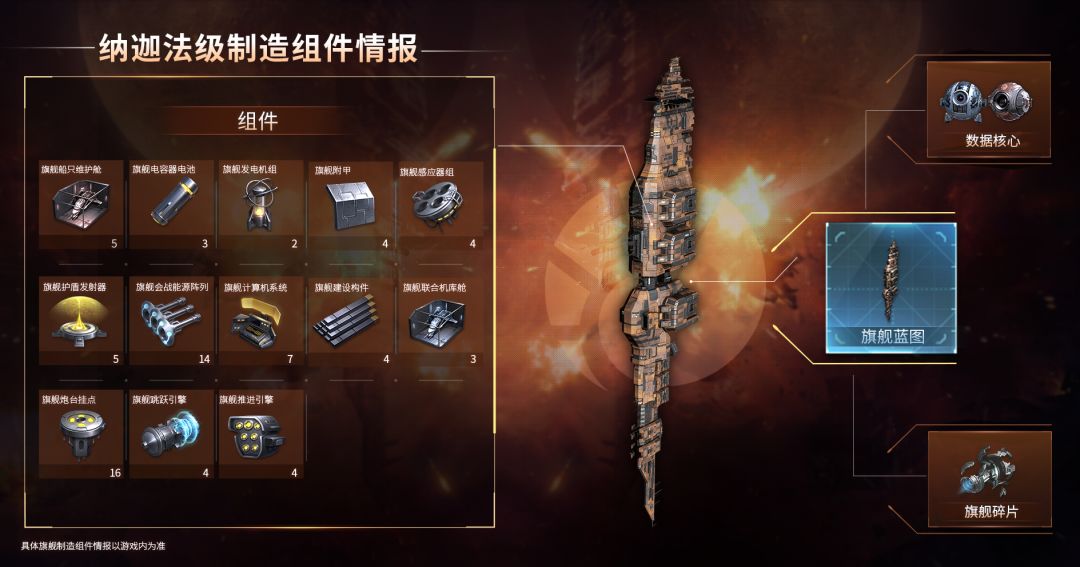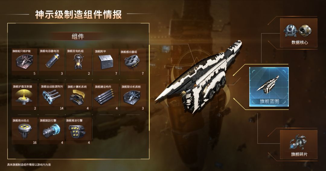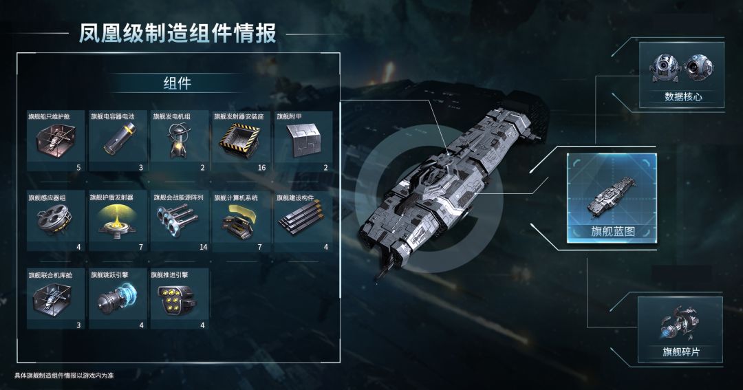 (以上为初始数据,旗舰制造所需组件可通过技能和建筑等加成来降低需求,请以游戏内实际为准。)