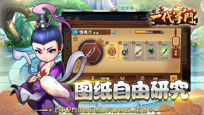 装备打造:多种装备配方可以研究和打造,让门下弟子打造,并在商铺出售,以获得门派资金。
