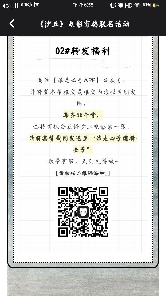 02#转发福利 关注〔谁是凶手APP〕公共号,并转发本条推文或推文海报致朋友圈,“集66个赞”,也将有机会获得沙丘电影票一张。请将集赞截图发至“谁是凶手编辑―金子” 数量有限,先到先得 请扫下面的二维码添加