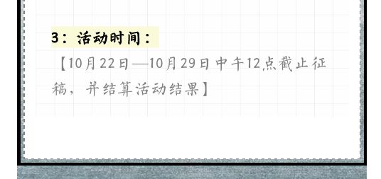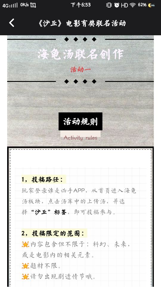 有两个活动,欢迎大家踊跃参加,奖品多多。 活动一: 海龟汤联名创作 活动规则 1.投稿路径: 玩家登录谁是凶手APP,从首页进入海龟汤板块,点击汤库上传汤,并选择“沙丘”标签,即可投稿参加。 2.投稿限定的范围 ①内容包括但不限于:科幻、未来,或是电影内相关元素。 ②题材不限 ③请勿出现剧透情节 3.活动时间 10月22日―10月29日中午12点截止征稿,并结算活动结果