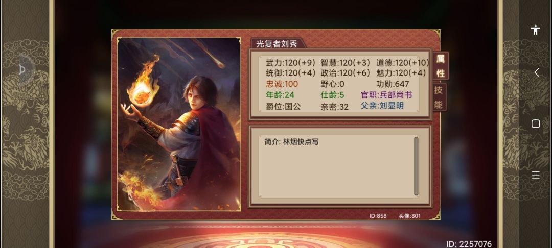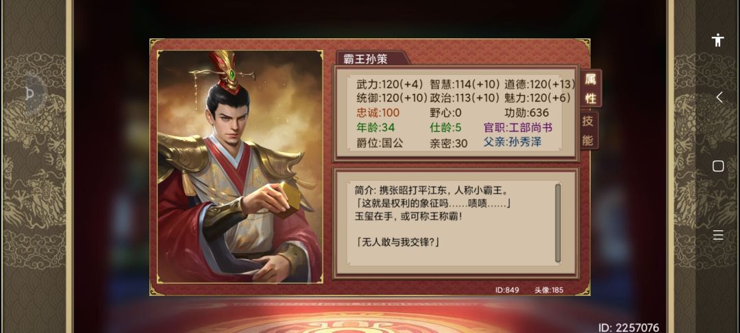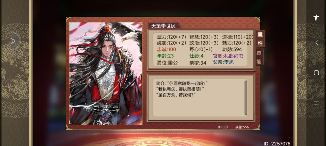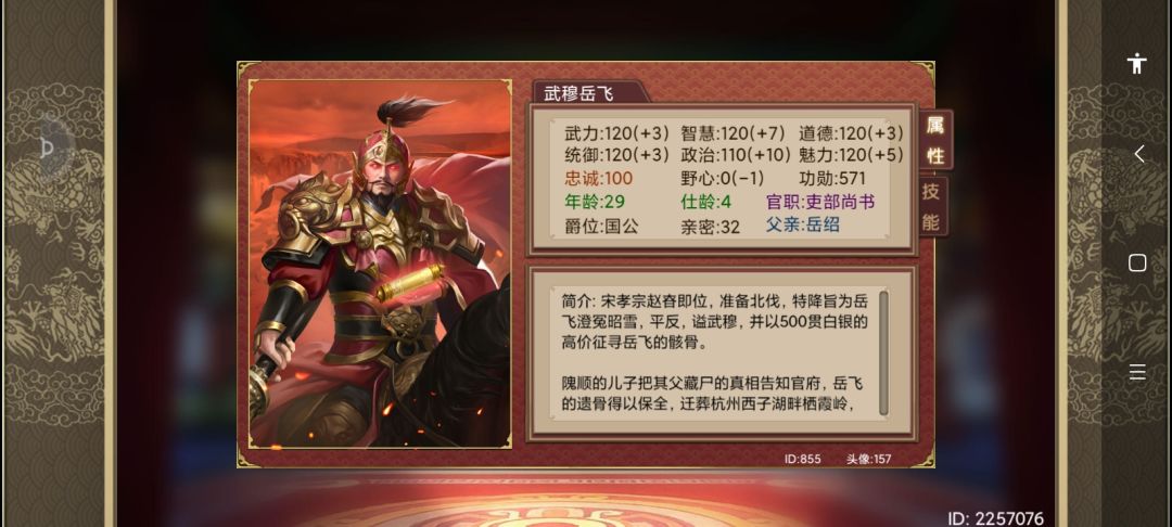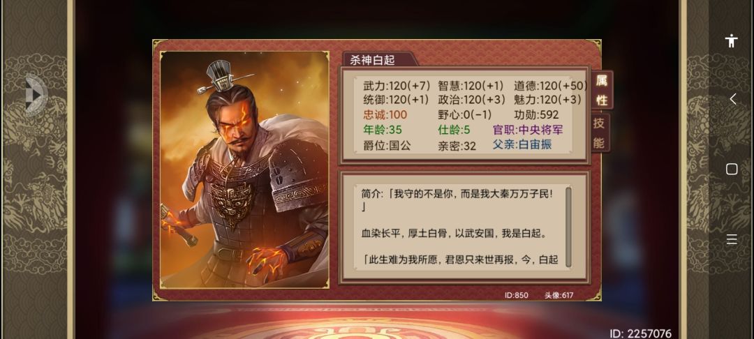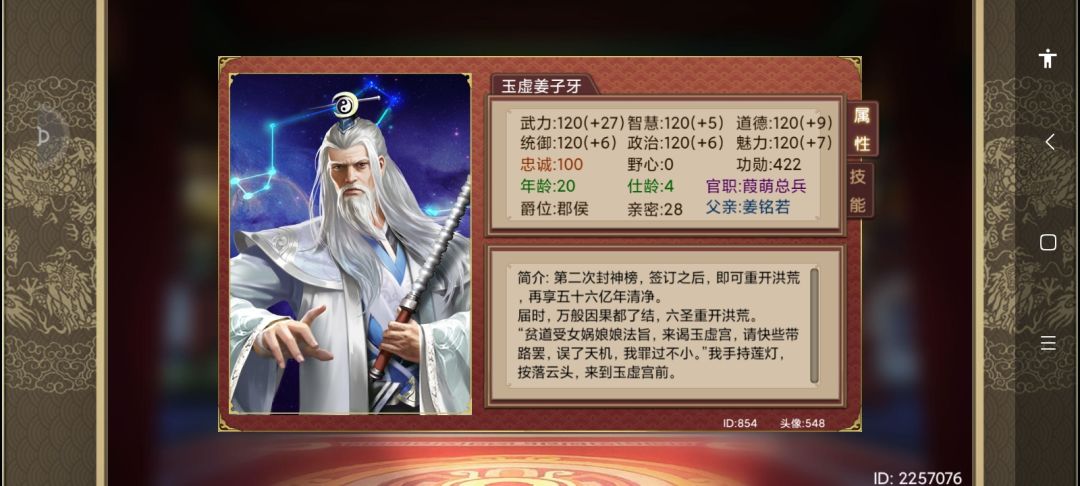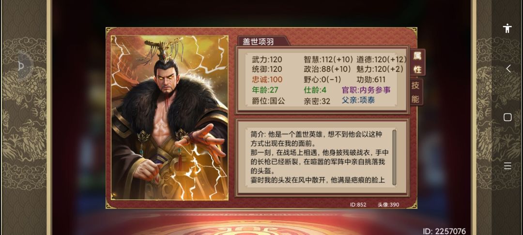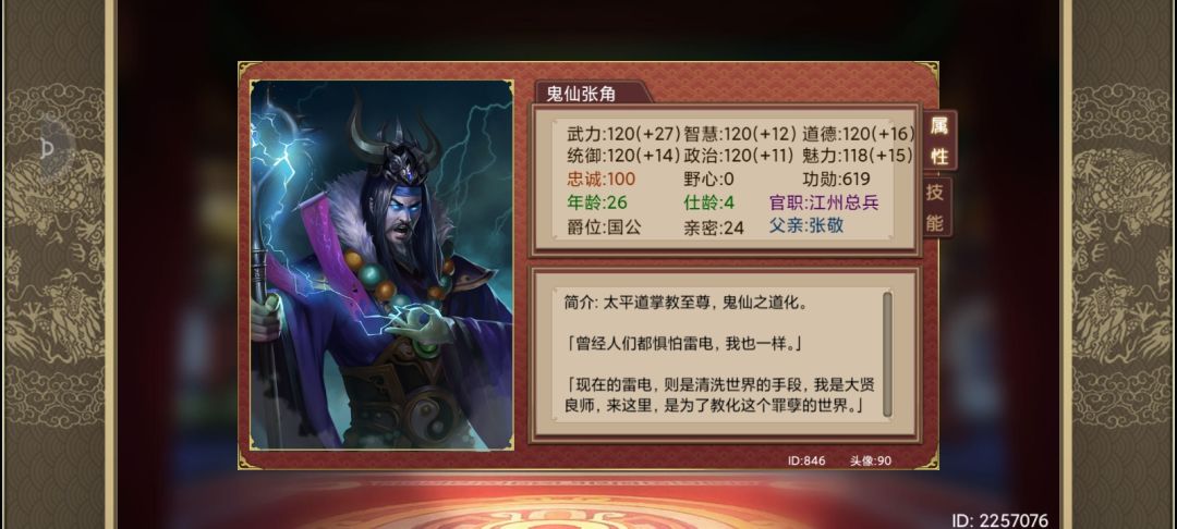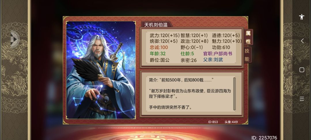 九品中正制的主要作用是为了让中央官员推荐亲戚的概率大一点,我个人不清楚是否会被亲戚概率叠加,因为文本没写,千古一帝也可以带,这样一来在后宫咸鱼的时候就会刷到神将了(其中超武鳌拜的野心是100,我还没来得及给他截图他就被弹劾死亡了)