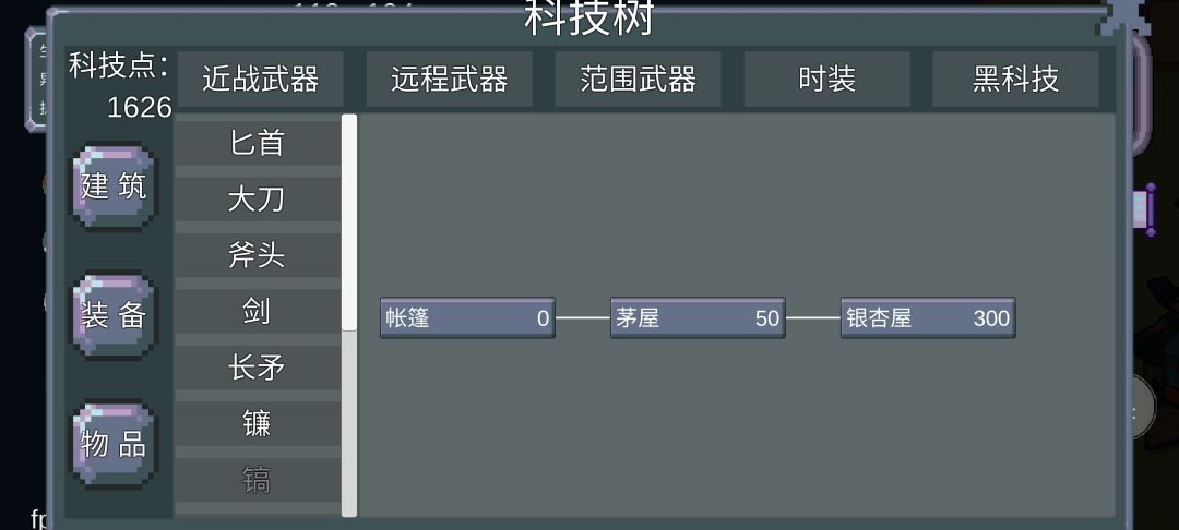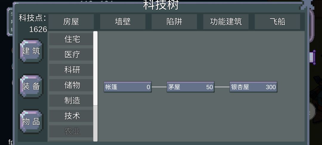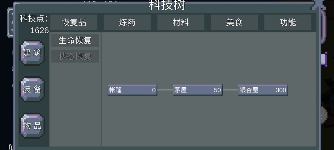 科技树靠科技点解锁,解锁后可以在锻造里找到并消耗对应资源制造出来,总共分为建筑,装备,物品三大类(左边三个按钮),目前还有一些科技还不能研究,估计要等版本更新之后了