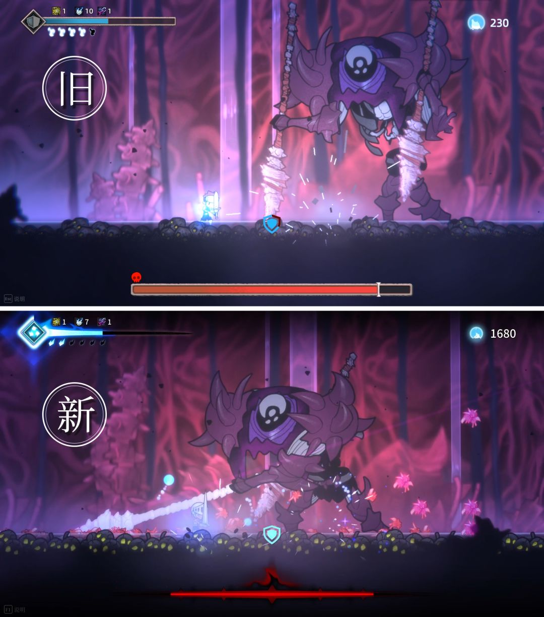 首先战士和怪物的血槽都经过了优化,红蓝火焰的跳跃会加深大家战斗的沉浸感和紧迫感,你看像这个血槽就很有故事↓